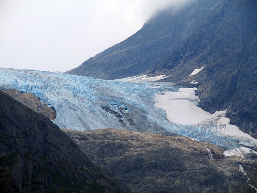 Im Moment raubt vielen von uns aber etwas ganz anderes, das sich langsam in unser Blickfeld schiebt, den Atem. Hoch über unseren Köpfen, dort wo die Bergspitzen an den Himmel "anstoßen", wird ganz viel zerklüftetes, gespaltenes, sich furchteinflößend aufgebautes blau-weiß-graues Eis sichtbar: der Jostedalsbreen "züngelt".