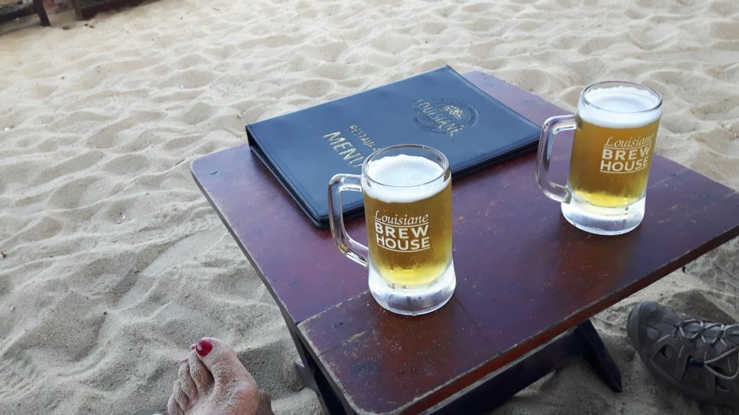 Schnell sind die Schuhe ausgezogen und so sitzen wir gemütlich wir unter einem Schirm am Strand und sagen dann mal Prost.