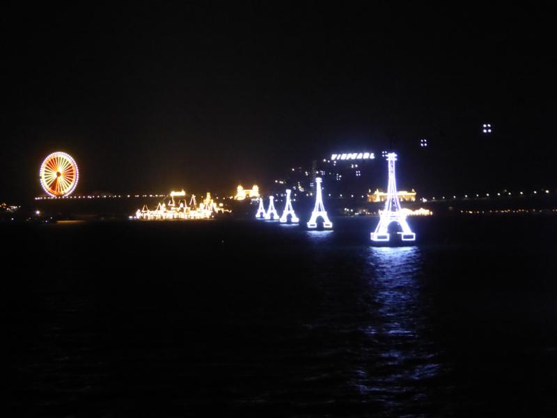 Vom Deck aus sehen wir die beleuchteten Pfeiler der Seilbahn rüber zur Insel Hon Tre. Das Riesenrad im Vinpearl Land dreht seine Runde … Hinter dem Hügel geht gerade der Mond auf ...