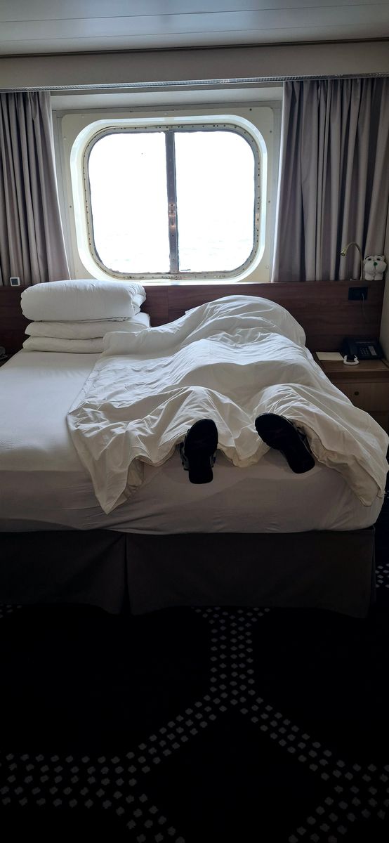 Wir schlafen bis 9 Uhr, anscheinend macht auch vielen anderen Passagieren die Zeitumstellung zu schaffen, denn im Bistro und Restaurant sind immer noch sehr viele Leute. In der Kabine hat es über Nacht auf 20° abgekühlt. Heute ist „verrückter Tag“. Viele Kellner und auch einige Gäste sind irgendwie verkleidet. Der Kreuzfahrtdirekt macht Durchsagen wie in einem ÖBB Zug, täuschend echt mit dem Wiener Dialekt (er ist Wiener). Die Außentemperatur ist 27° bewölkt, ein idealer Tag um außen die Liegen zu benützen. Beim betreten der Kabine waren wir erschrocken, der Kabinen Stewart hat das Bettzeug so arrangiert, dass es aussah als wenn jemand in unserem Bett liegt🙂.