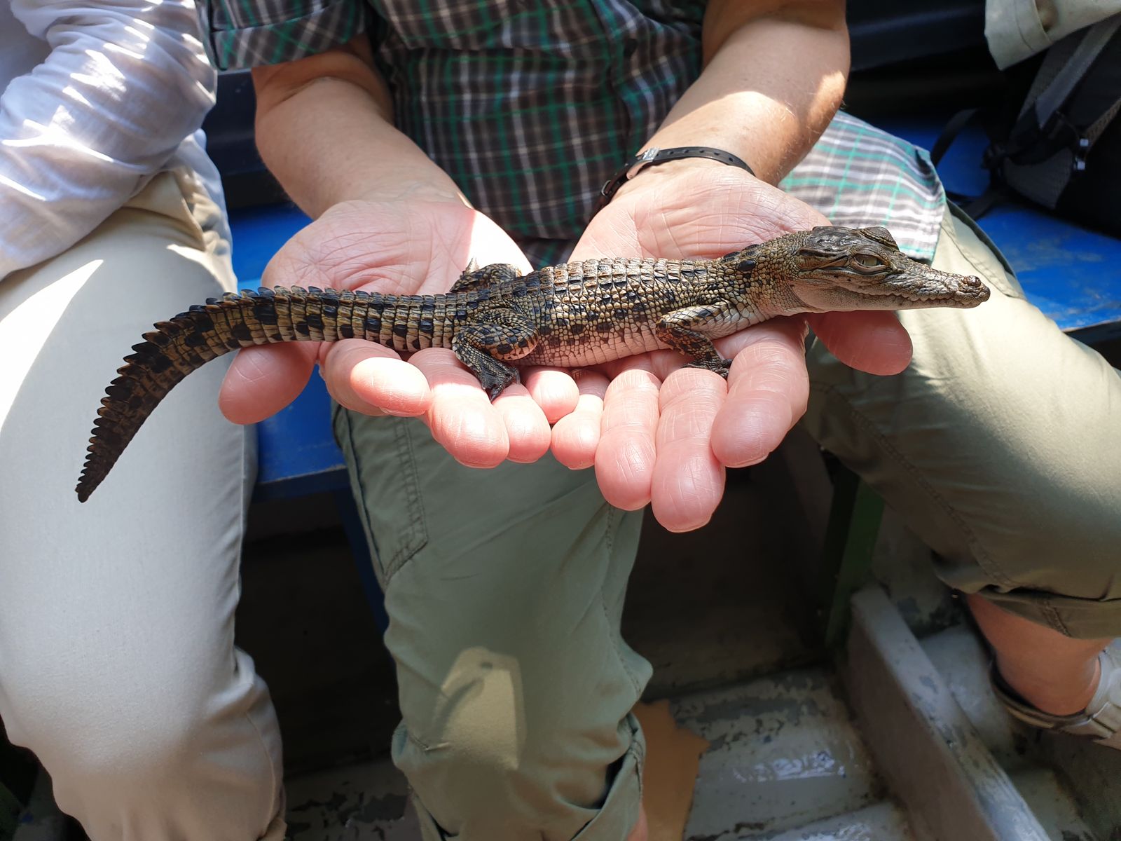 Von dort aus erreichen wir die Boote, mit denen wir auf dem Benotafluß unterwegs sein werden. Himmel, wenn ich an die letzte Tour zurückdenke … es gab allerlei Getier im Wasser und in luftiger Höhe, mit dem ich mir keinen Kontakt gewünscht hätte. Vögel, Affen, Schmetterlinge und plötzlich baumelte während einer Tour eine Schlange von Ast eines Baumes über unseren Köpfen. Okay, sie war anständig und hat uns nur erschreckt. Der Besuch eines Krokodilaufzüchters stand auch wieder auf dem Programm. Nein, ich konnte das Tier nicht auf die Hand nehmen – aber mein Mann war so mutig und streichelte es vorsichtig.