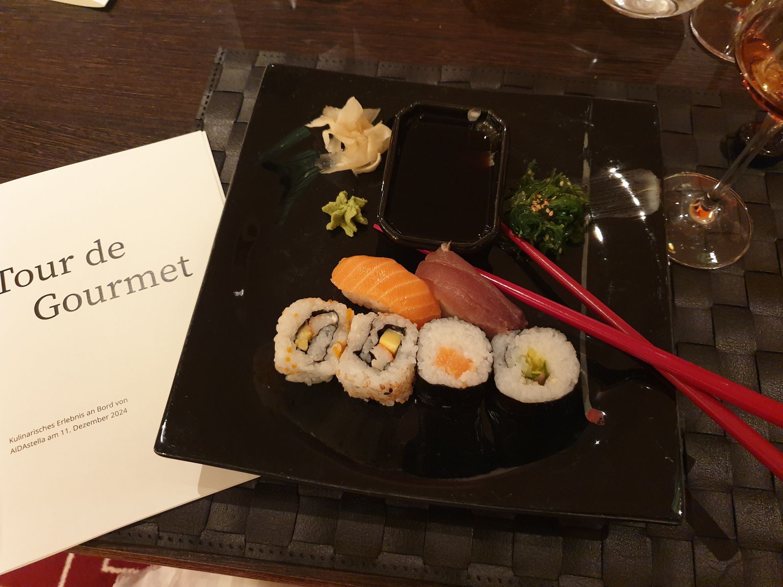 Station 3 ist das Gourmet-Restaurant Rossini. Ich gehe davon aus, dass es mehr Menschen gibt, die das Wort „eigentlich“ manchmal verdrängen. „Eigentlich“ bin ich satt, aber „eigentlich“ sieht alles so verlockend aus, dass ich doch noch etwas essen möchte. Und so erfrischt das Maracuja-Sorbet, bevor das Kalbsfilet sich auf dem Teller fabelhaft präsentiert. Dazu ein Sößchen mit Spitzmorcheln zu Trüffel-Kartoffeln und delikate Portwein-Schalotten, verführerisch lecker!