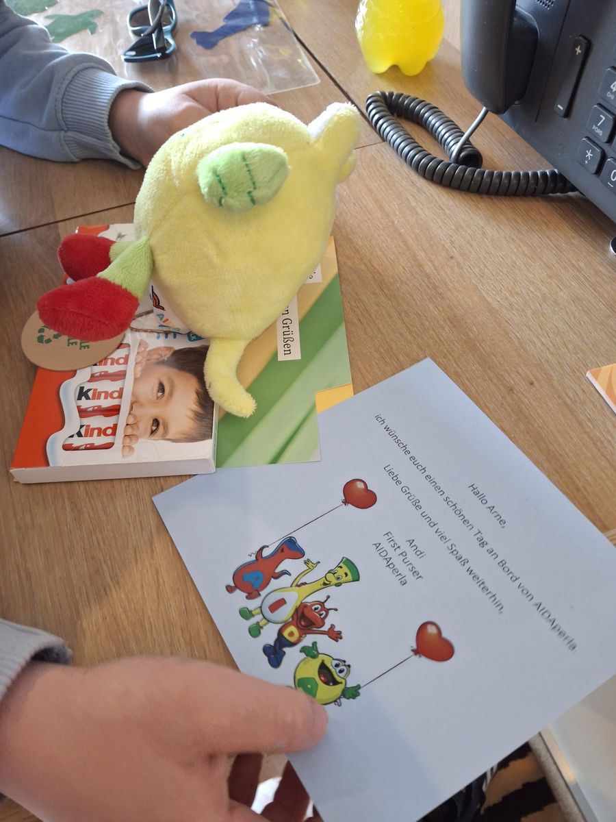 Ich bin echt begeistert, wir kinderliebt doch die AIDA immer ist! Vor allem lag der Fehler bei unserer Seite und der Kleine bekommt noch ein Geschenk dafür. Arne hat sich dann auch gleich ans Werk gemacht und noch ein schönes Bild für Andre gemalt, als Dankeschön, welches wir noch zur Rezeption gebracht hatten
