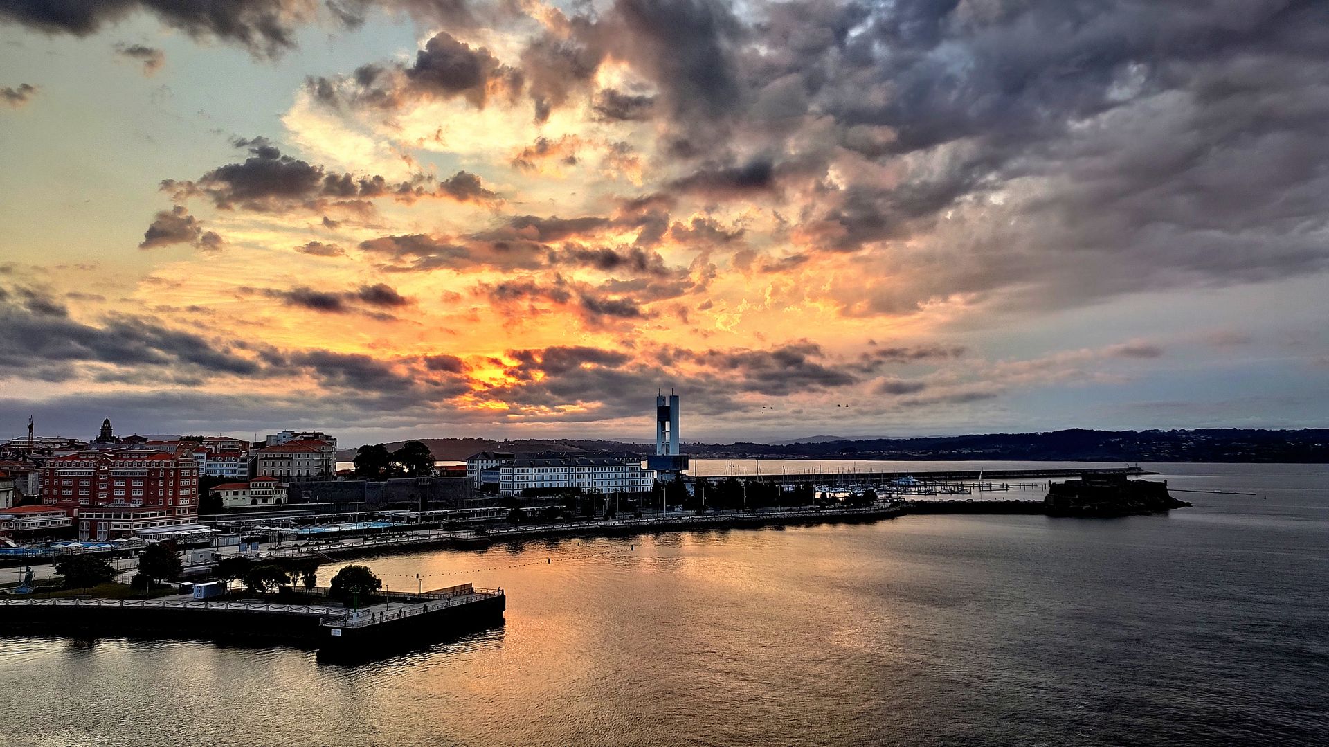 und bewunderten dabei das zweite Wahrzeichen der Stadt. Die Galerias coruñesas auf der anderen Seite des Sporthafens. Eine wunderschöne Häuserkulisse, sozusagen Glas an Glas, die zum Titel Coruñas „Stadt des Glases“ führte. Der Dunst hatte sich inzwischen aufgelöst; die Wolken führten mit der aufgehenden Sonne zu einem interessanten Lichtspiel: