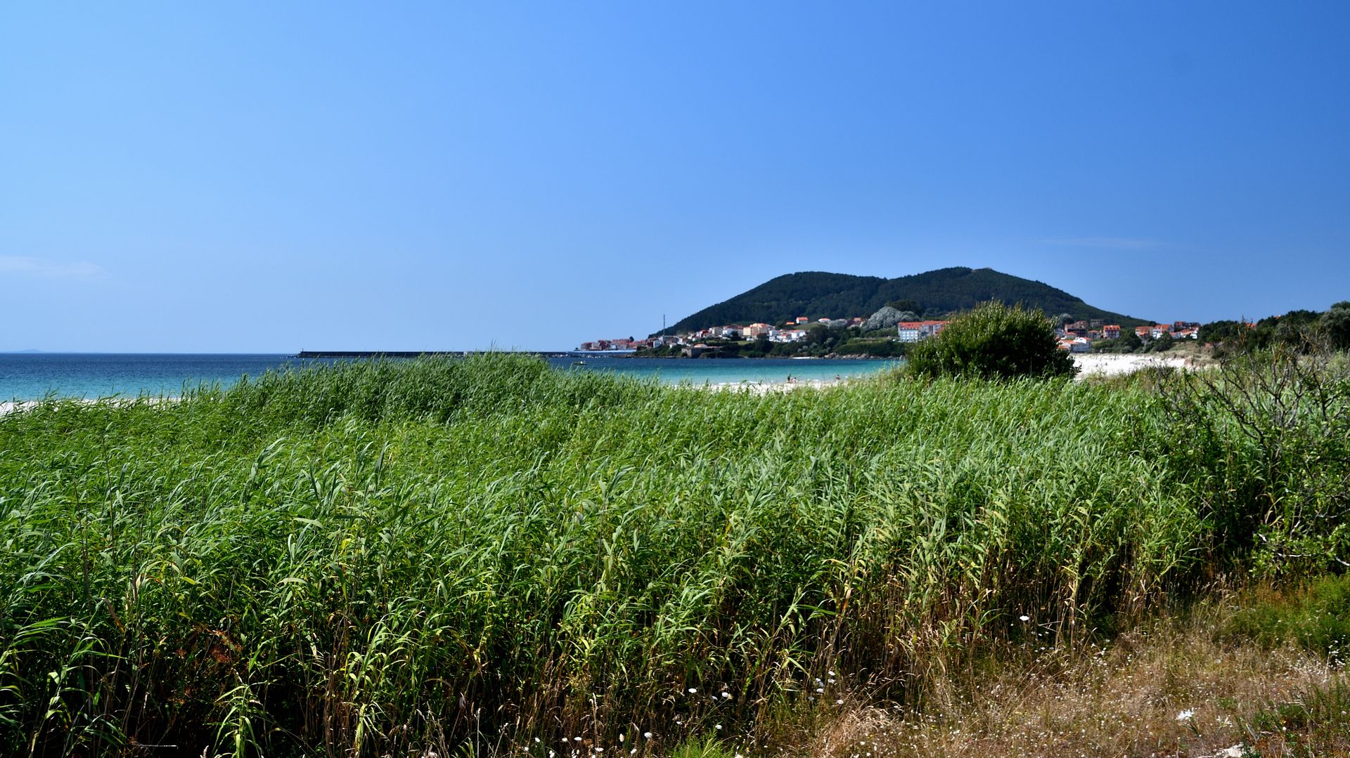 So, wir hatten das einstige Ende der Welt verinnerlicht und machten uns auf, den westlichsten Punkt des spanischen Festlands aufzusuchen. Quasi das echte Ende der Welt für manche Spanier. Also rein ins Auto und los. Zunächst auf denselben Straßen wie während der Hinfahrt. Also durch Finisterre, wo uns ein Hinweisschild Playa lockte. Wir gehorchten und befanden uns nach kurzer Zeit vor dem Langosteira-Strand. Nicht so wie in Südspanien oder auf den Kanaren. Vor dem Strand befand sich ein Schilfgürtel.