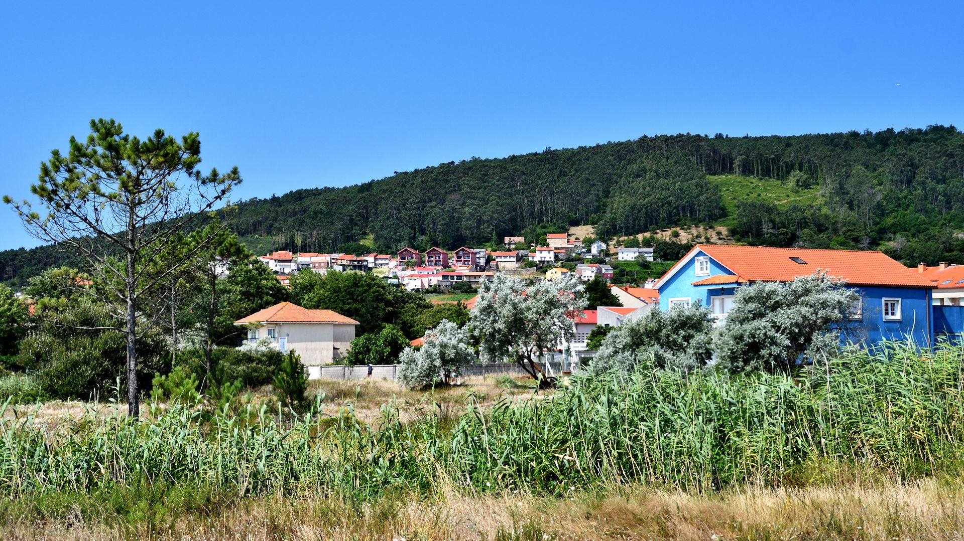 So, 53 Jahre weiter. Und zwar im dank des Regenreichtums fruchtbaren und damit grünen Galicien. Die hügelige Landschaft erinnerte an unsere Mittelgebirge, wenn auch neben Kiefern ein bestimmter Baumtyp vorherrschte: Eukalyptus. Diese schnell wachsenden Bäume wurden einst als Stütze der Holzindustrie angepflanzt und verbreiteten sich immens. Zu immens, ohne Unterlass. Man möchte sie gerne los werden. Doch das klappt nicht …