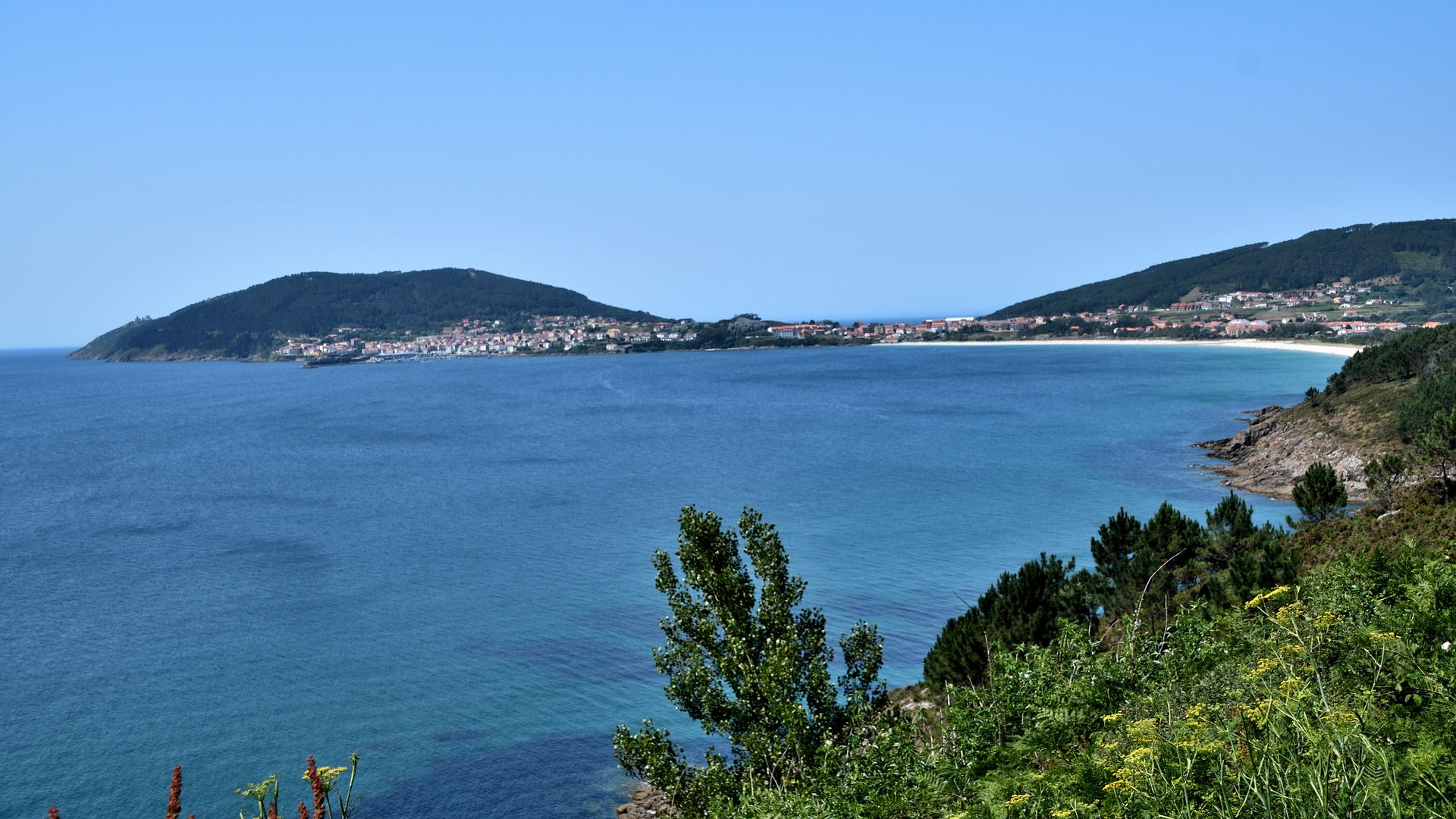 Ein paar Kilometer hinter Finisterre lockte einer der wenigen Parkplätze unserer Route. Mit einem herrlichen Blick auf den Ort, den langen Strand und das Cabo Fisterra. Selbst der Leuchtturm war noch zu erkennen.