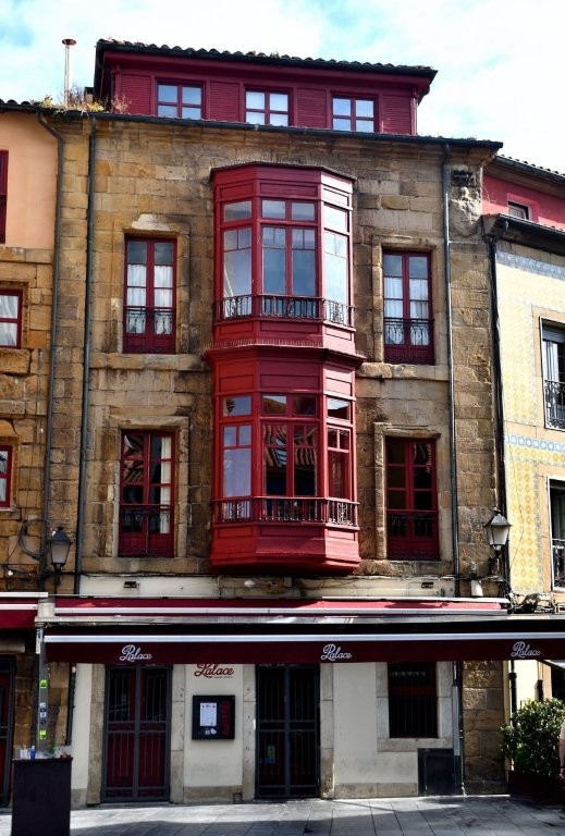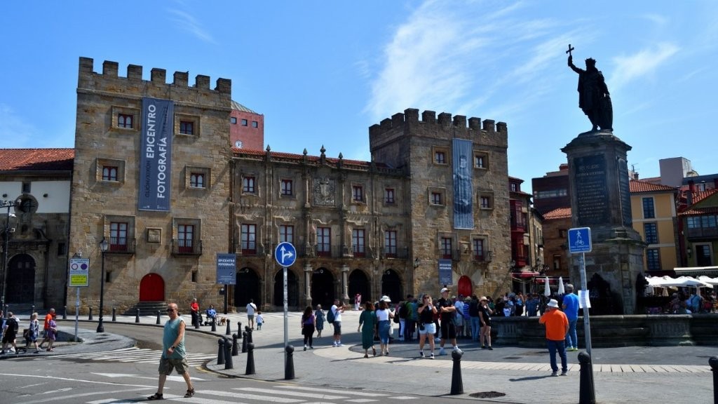 Wie den Palast von Revillagigedo (rechts im Bild zu sehen), die Stiftskirche San Juan (links neben dem Palast) und ein gerade mal zwölf Jahre altes Gebilde – den Árbol de la Sidra; zu ihm komme ich später. Der Barock-Palast mit gotischen Türmen wurde im 18. Jahrhundert erbaut und zeigt die typische asturische Palastarchitektur der damaligen Zeit;