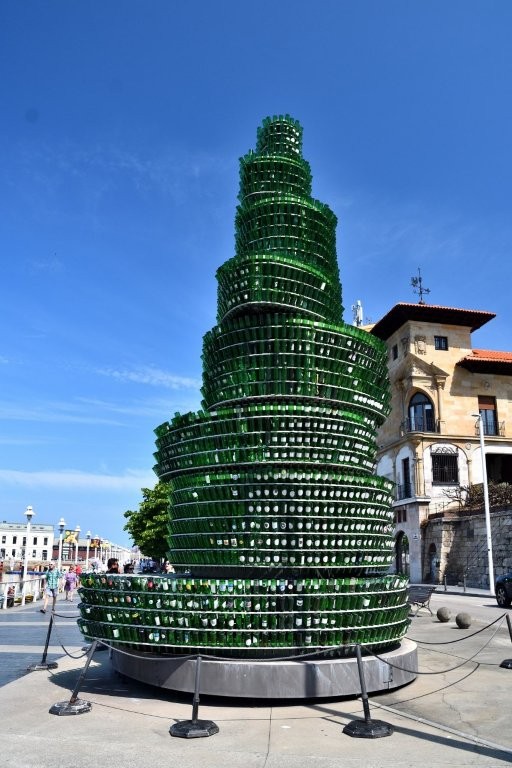 Sinn und Zweck dieses Flaschenbaums: Er soll das Bewusstsein zum Recyceln schärfen und den asturischen Cidre bekannter machen. Ob das gelingt? Egal, die elegant geschwungene, nach oben immer schmaler werdende Flaschenbatterie sah interessant aus. Besonders in der Dunkelheit wird sie richtig erstrahlen, wenn die in ihrem Inneren installierten Lichtquellen eingeschaltet werden.