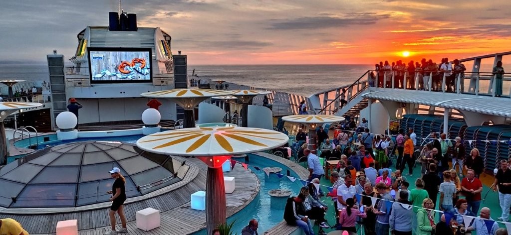 Es war tüchtig ´was los auf dem Pooldeck. Aber im Vergleich mit bisherigen AIDA-Fahrten meinten wir, dass früher mehr Publikum an diesem stimmungsvollen Ereignis teilnahm.