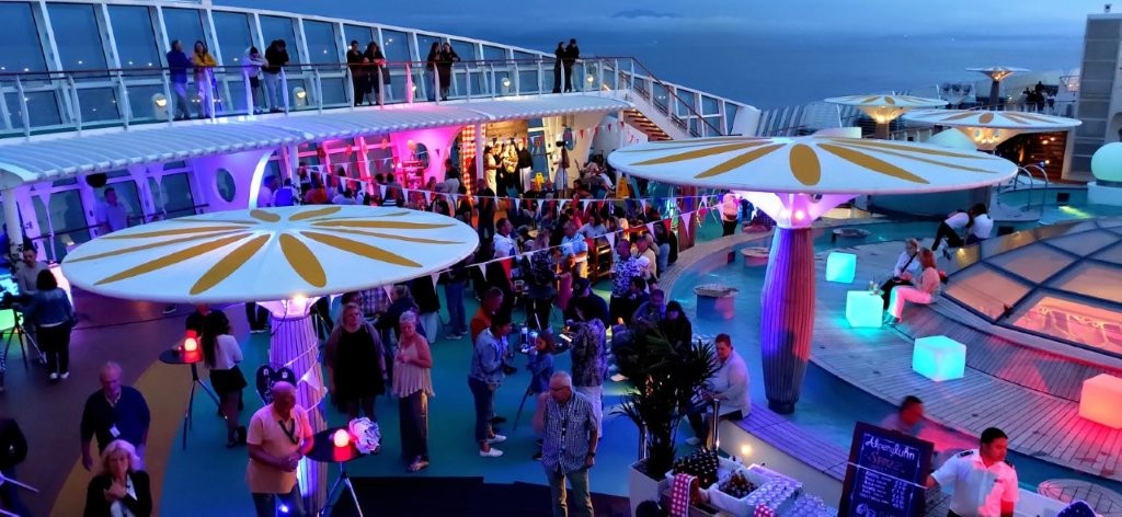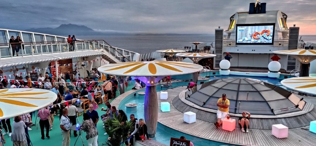 Nach dem Abendessen war es für uns wieder Zeit für den Strandkorb. Wir hatten einen ausgezeichneten Ausblick auf das Pooldeck, auf dem an diesem Abend das