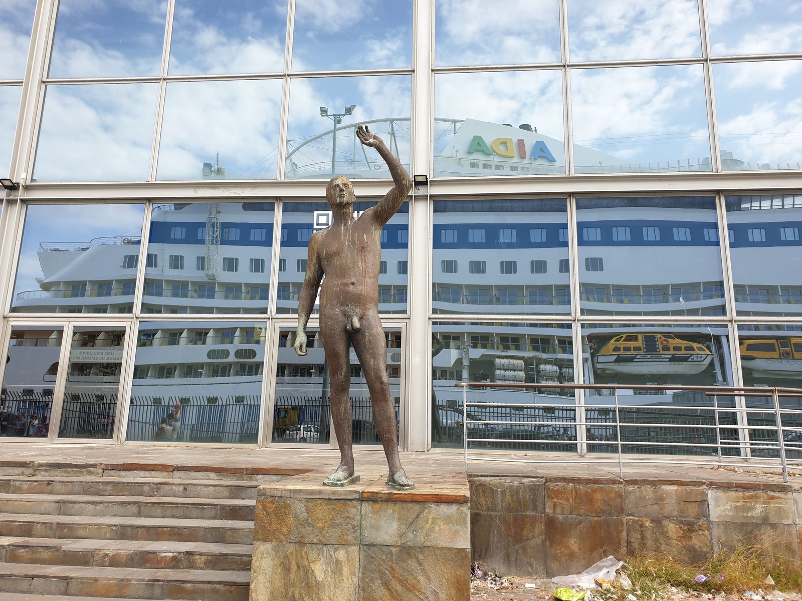 Wir schnappen unsere Taschen und schon stehen wir vor dem modernem Gebäude direkt an der Pier. Es ist das Kongresszentrum der Stadt, das 2005 in Betrieb genommen wurde. So schwach erinnere ich mich an die Skulpturen, die dort draußen zu sehen sind. „Schau mal, der Mann hat immer noch keine passende Hose gefunden und zeigt sich in seiner ganzen Schönheit.“ Mein Mann lacht „der hat auf jeden Fall keinen Stress mit Klamotten in den Läden anschauen und mit seiner Frau zu diskutieren, ob er das wirklich anziehen soll!“