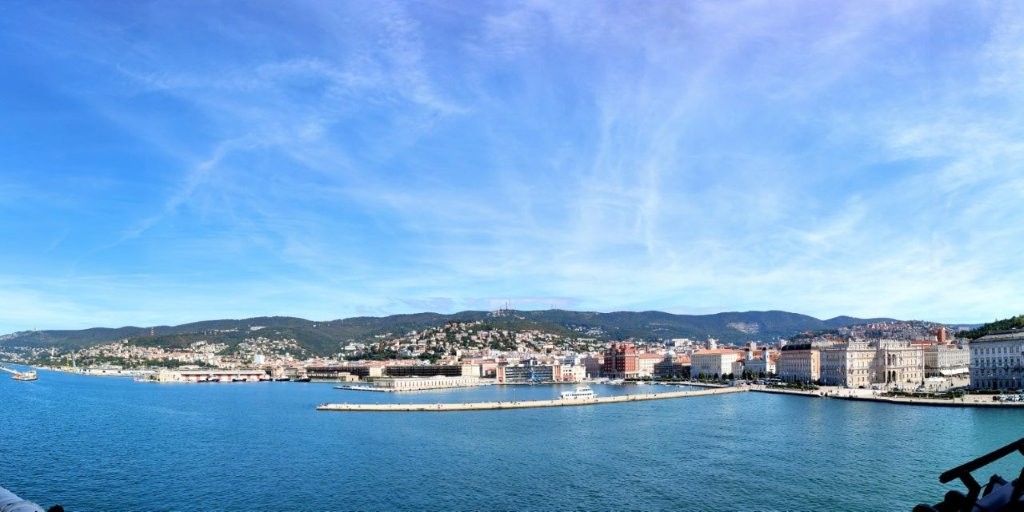 Endlich – ein Zipfel der Adria zeigte sich. Ein wenig später immer mehr. Blaues Meer, Segelbötchen, Schiffe auf Reede. Und in den Vororten Triests der Beginn einer kilometerlangen Beton- und Steinpromenade über der Steilküste mit Zugang zum Wasser. Die Promenade war gut besucht und belegt. Liegestühle, Handtücher, Sonnenanbeter. So gut wie keine Liegenbesetzer … grins … An diesem mit 28° C warmen Sonntag zog es viele Bewohner an die Küste. Vereinzelte Restaurants, die nicht gut besucht waren – es war noch recht früh. Der Bus kam nur langsam voran. Die Innenstadt kündigte sich an. Doch vorher passierten wir riesige Fabrikkomplexe, die bessere Zeiten gesehen hatten. Marode, teils mit Bäumchen und Sträuchern auf den Dächern und in Fenstern. Zwischendurch renovierte Gebäude. Dann der Beginn des Kopfbahnhofs von Triest. Hmh … würde man die im Grunde genommen attraktiven langen und geduckten Anlagen irgendwann entkernen und aufmotzen? Lange sollte man nicht mehr warten …