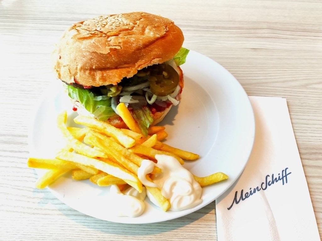 An unserem Eingangsritual nach dem Entern eines Mein Schiff kamen nicht vorbei: Verputzen eines Hamburgers in der Tag und Nacht – Bar. Es war schließlich Mittagszeit – passte!