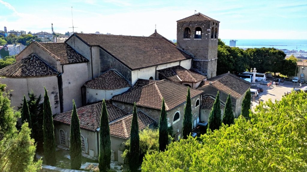 Vor den unter der Sonne bratenden „Römern“ flüchtete ich in ihren schattigen Bereich inmitten von „Resten“ heidnischer, weltlicher und christlicher Mauern. Vor vielen Jahrhunderten bestimmte ein Triestiner Bischof, dass die damaligen zwei nebeneinander stehenden Kirchen durch Umbaumaßnahmen als Heimstatt der Reliquien des Triestiner Schutzpatrons Justus (oder auch San Giusto) zusammengelegt werden sollten. Eine gelungene Verschmelzung von zwei Gotteshäusern, was auch im Inneren zum Ausdruck kommt.