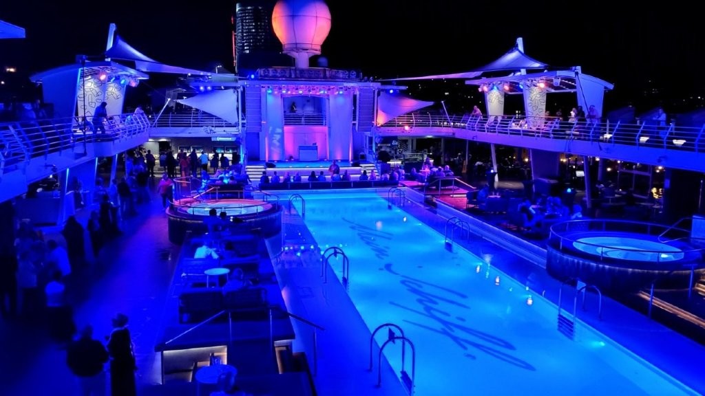 Es wurde richtig dunkel. Das Pooldeck wurde immer voller. Schließlich war es angenehm, am Tag der Anreise die Abendstunden im bequemen Sitzen zu verbringen.