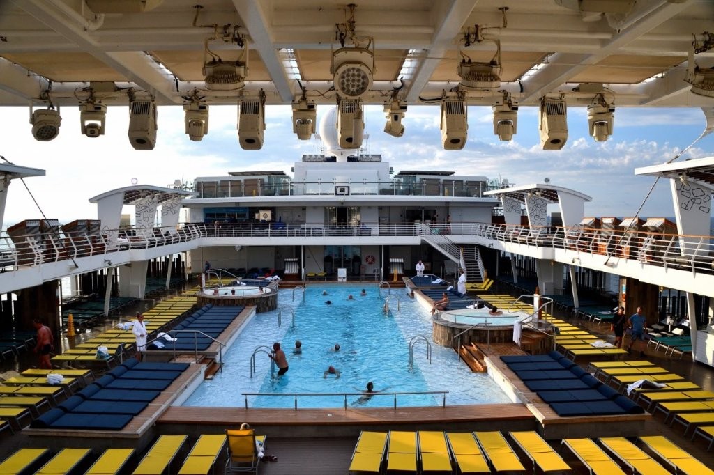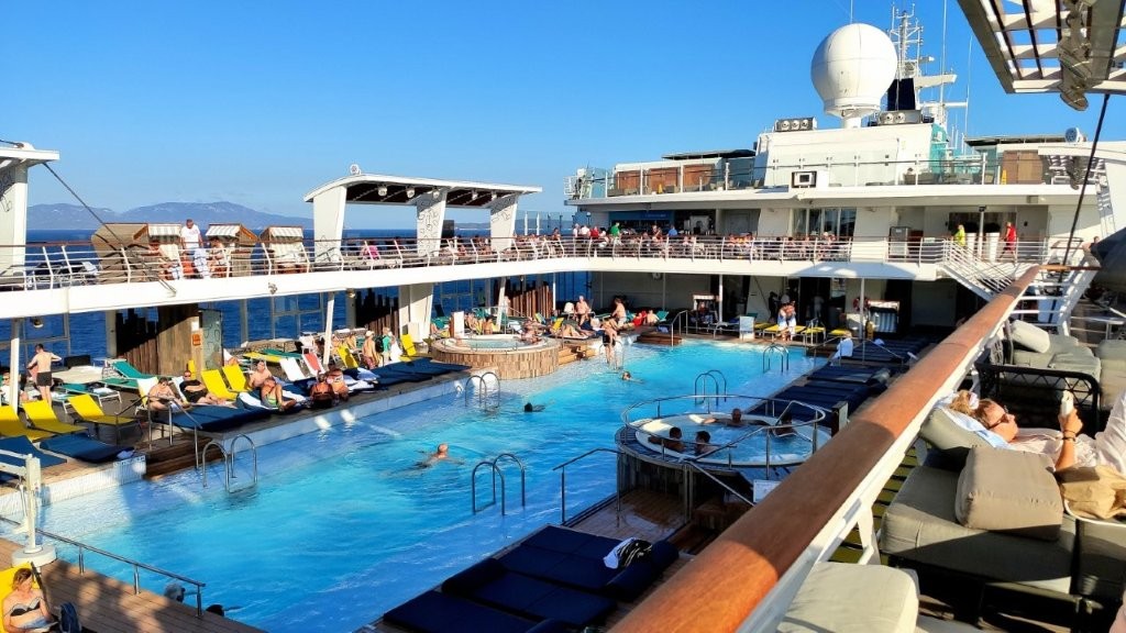 Übrigens, die Schwimmer zogen diszipliniert ihre Runden. Kein Springen vom Rand in den Pool. Das mag auch daran liegen, dass bei einer Gesamtzahl von 2.559 Passagieren nur ca. 60 Kinder an Bord waren; das Durchschnittsalter betrug 59 Jahre. Noch einmal zum Poolspringen, damit kein falscher Eindruck entsteht: Beobachtungen auf anderen Schiffen ergaben, dass nicht nur Kinder sondern auch viele Erwachsene rücksichtslos in die Pools sprangen.