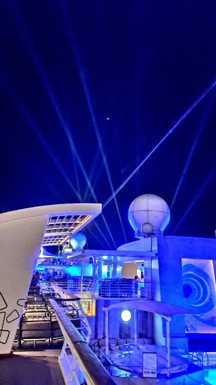 Für 21.30 Uhr war der Auslaufsekt auf dem Pooldeck angekündigt. Gefühlt besetzten Passagiere zweier großer Kreuzfahrtschiffe die oberen Außenbereiche. Keine Sitzmöglichkeiten - auch nicht um die Bars herum. Der Lärmpegel hatte sich noch einmal enorm gesteigert … Also: Sekt geschlürft, das stimmungsvolle Auslaufen mit „Die große Freiheit“ sowie die Lasershow