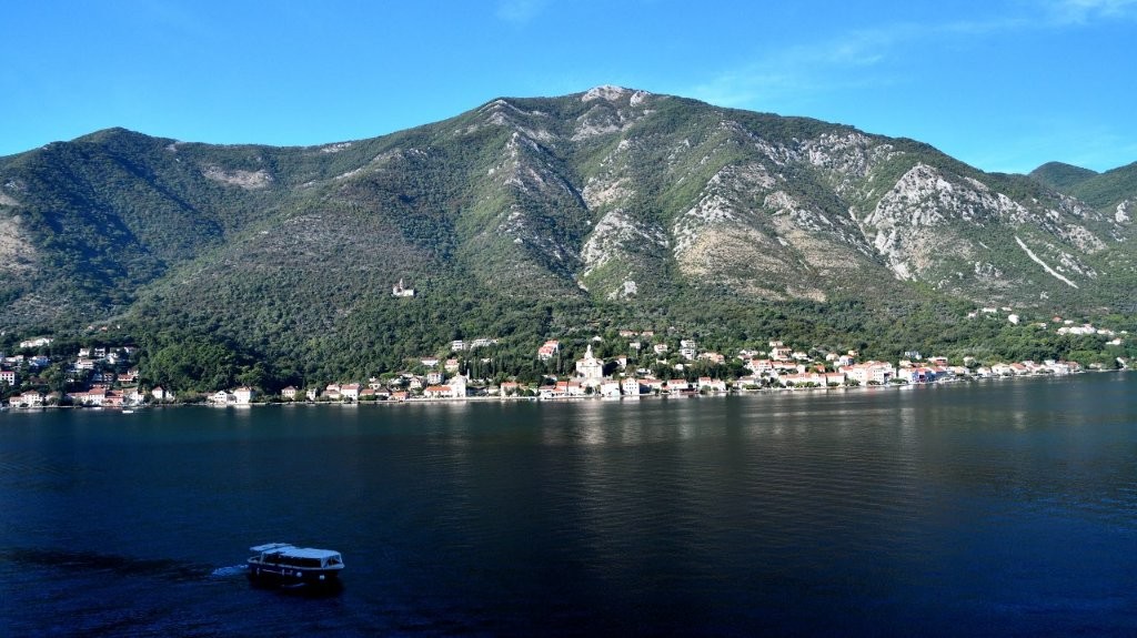 Unser Schiff lag auf der Höhe des kleinen Orts Prčanj – direkt gegenüber von der katholischen Mariä-Geburt-Kirche und der orthodoxen Kirche St. Nikolaus mit angeschlossenem Kloster. Die Felsen auf der Backbordseite verschwanden weitgehend in den Wäldern. Mittendrin ein weiteres Kirchlein. Oder ein Kloster? Die Bergrücken auf der anderen Buchseite waren kaum bewaldet; graue Felsen herrschten vor. Hinter uns der Eingang der Bucht mit dem in der Sonne liegenden Örtchen Ljuta und den gegenüber liegenden Hotelanlagen.