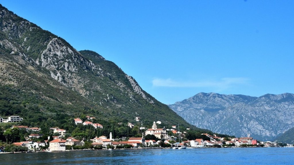 Einfach gigantisch, wie die steilen Berge die Bucht und damit auch unser Schiff umschlossen. Unsere Fahrt zum Anleger dauerte ca. 20 – 25 Minuten. In dieser Zeit konnten wir die montenegrinische Fjordküste genießen. Zunächst passierten wir Prčanj mit der Mariä-Geburt-Kirche.