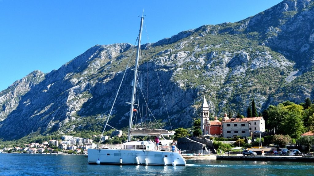 Doch zurück zu dem vor uns liegenden Kotor. Im Ortsteil Dobrata fuhren wir an der malerisch ein wenig höher gelegenen St.-Eustachius-Kirche vorbei; ein Katamaran machte sich bereit für eine Ausflugsfahrt.