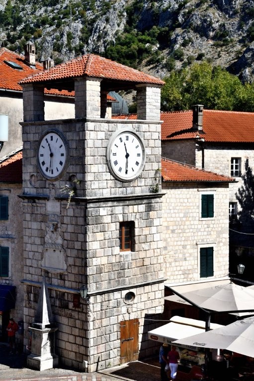 dem Uhrturm. Baubeginn im damaligen modernen Renaissance-Stil war Anfang des 17. Jahrhunderts während der venezianischen Herrschaft. Auf die damaligen Herrscher weist ein unter dem Zifferblatt angebrachter Giebel mit dem (venezianischen) Löwen des Heiligen Markus hin. In den meisten Fällen tragen Uhrtürme nur ein Zifferblatt – im Gegensatz dazu befindet sich an jeder Seite des Turms jeweils ein identisches Zifferblatt, so dass die aus allen Richtungen strömenden Kotorer oder auch Besucher wissen, was die Stunde beschlagen hat. Übrigens war der Turm vor dem 1667er Erdbebens nicht fertiggestellt; aufgrund des Bebens war neigte sich der Turm. In den Folgejahren versuchte man, ihn wieder in die Senkrechte zu bringen – ohne Erfolg. Bis die Erde im Jahre 1979 bebte und der Turm dadurch wieder in die Senkrechte kam. Man muss nur Geduld aufbringen …
