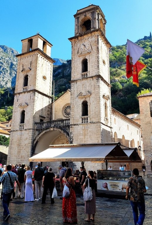 Die Sankt-Tryphon-Kathedrale, vor deren Portal sich sehr viele Besucher aufhielten. Es handelt sich um die katholische Kathedrale des Bistums Kotor. Sie wurde ab Anfang des 12. Jahrhunderts auf einer aus dem neunten Jahrhundert stammenden Kirche errichtet und gilt als größtes romanisches Gotteshaus der östlichen Adriaküste. In ihr kann man wertvolle Kunstsammlungen wie Gemälde, Ikone, Gold- und Silberschmiedearbeiten besichtigen. Wir ließen uns dazu nicht verlocken und schlenderten – vorbei am schräg gegenüber liegenden Drago Palast –
