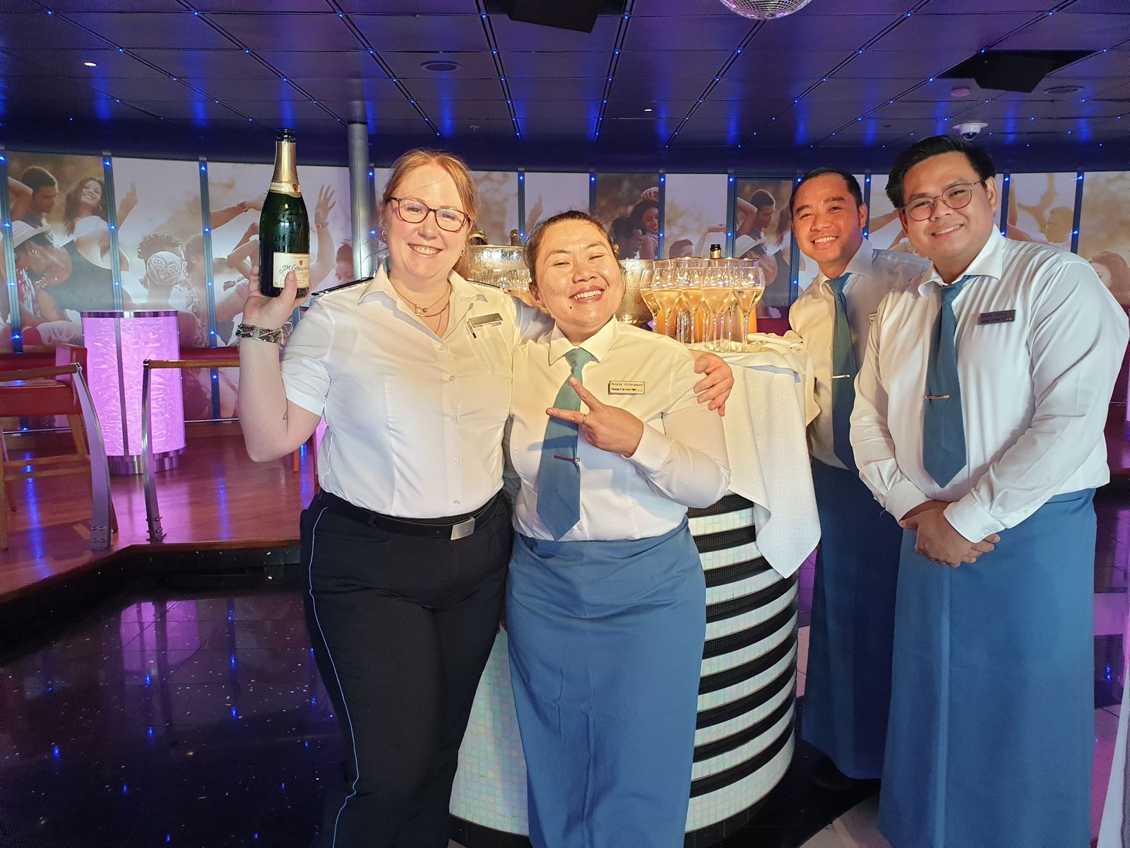 Ein wenig Luft holen tut gut und wir drehen unsere Deckrunde und dann geht es in die AIDA Bar zum Discofox Marathon. Oh meine Güte, was wird dort getanzt – ohne Pause. Als Belohnung gibt es ein Gläschen Sekt. Die BandMates spielen ununterbrochen.