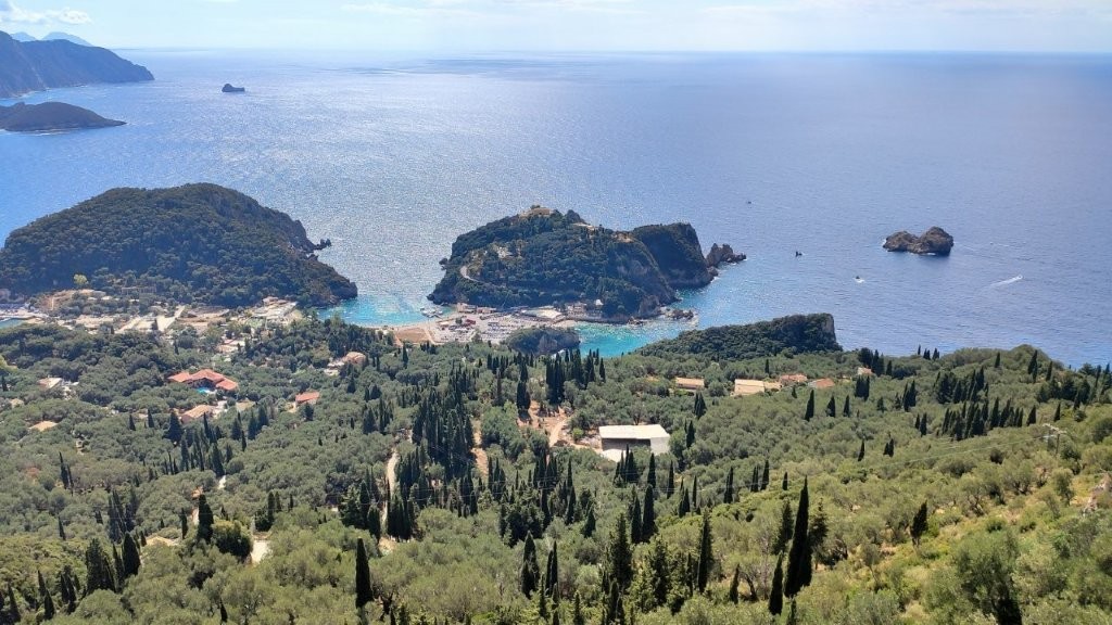 Irgendwann mussten wir unsere vollen Bäuche wieder in den Bus verfrachten. Kam Müdigkeit auf? Nein, denn der weitere Teil der einstündigen Panoramafahrt quer über die Insel hielt uns wach. Die im Grunde gleich bleibende Natur faszinierte. Und auch die vielen Serpentinen sorgten dafür, dass wir nicht zu einem Nickerchen kamen. Dann zwischendurch das Erreichen des Troumbéttas – Passes. Leider ohne Fotostopp. Von dort aus ging es wieder runter. Selbstverständlich mit vielen Serpentinen. Bis wir den Beginn der Halbinsel Kanoni erreichten. Wer diesen Flecken nicht besucht hat, war nicht auf Korfu. Zunächst erspähten wir im Vorbeifahren bei Paleopolis die Ruinen einer frühchristlichen Kirche. Nach kurzer Weiterfahrt ergatterte unser Busfahrer einen Parkplatz am Rande eines Aussichtsplatzes. Von dort aus „schossen“ in der Vergangenheit die Besucher die meisten Fotos während ihres Korfu-Aufenthaltes. Mit Sicherheit auch die zukünftigen Besucher.