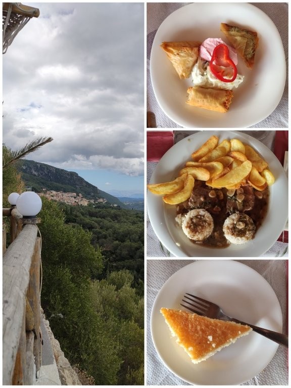 Die Speisen entsprachen vom Geschmack her nicht den bei uns in Deutschland in griechischen Restaurants servierten Speisen. Eher landläufig – wie man eben auf Korfu oder in Griechenland kocht. Neben dem üblichen erfrischenden Bauernsalat gab es – natürlich für jeden - einen Vorspeisenteller. Drei kleine Teigtaschen gefüllt mit Schweinefleisch, Spinat bzw. Käse; dazu Taramosalata (Creme aus Fischrogen, Weißbrot, Olivenöl und Zitrone) und Tzatziki. Als Hauptgericht genossen wir Stifado, ein sehr gut gewürztes Ragout mit viiiiel Knoblauch, mit frittierten frischen Kartoffelspalten und Reis. Die Mahlzeit rundete ein Stück Ravani ab – ein in Zuckerguss (leider zu stark) getränkter Grießkuchen. Dazu ein leichter Wein und/oder Wasser. Herrlich – und das bei dem Ausblick.