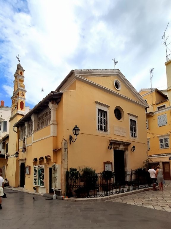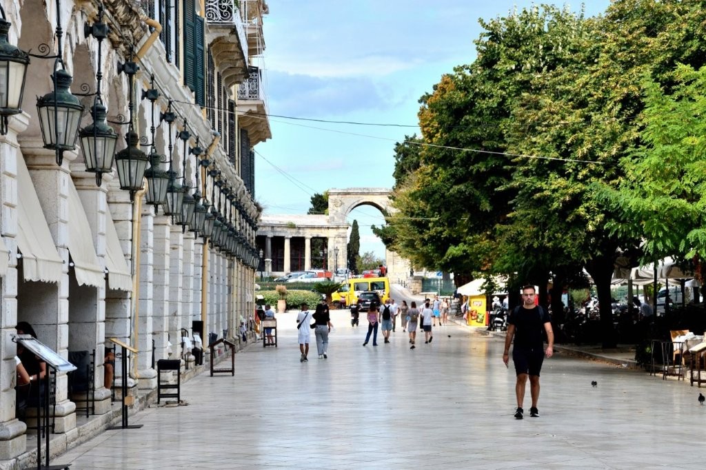 Vorbei an Cafés und Restaurants und an der orthodoxen Spiridon Kirche, in dem der Schutzpatron der Insel, der heilige Spiridon, in einem Sarg ruht. An bestimmten, für Korfu wichtigen Tagen wird er durch die Straßen der Stadt getragen.