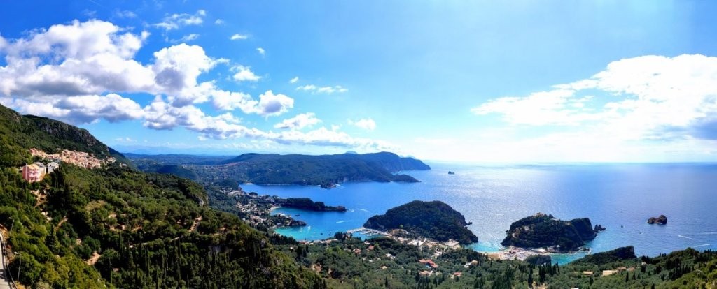 Wir kamen an. Im Restaurant „Castellino“. Hoch oben am Berg. Und vom Parkplatz aus mussten wir noch höher. Weiter im Restaurant. Noch zwei Etagen bewältigt. Aber die Mühen hatten sich gelohnt. Ein großer Speisesaal, an einer Seite offen mit Ausblick auf Paleokastritsa, die von uns zuvor besuchten Buchten, die grüne Umgebung.
