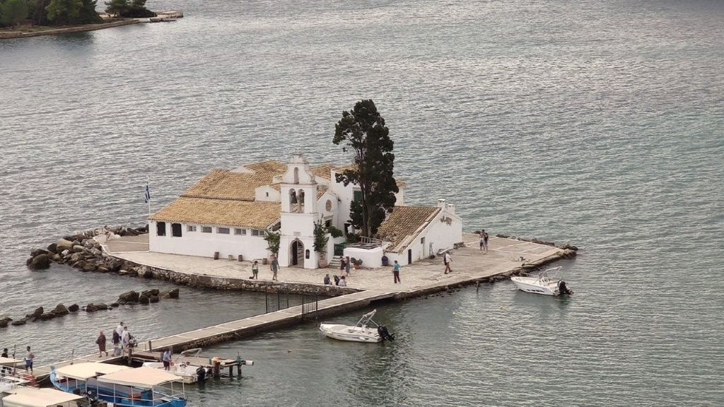 Irgendwann mussten wir unsere vollen Bäuche wieder in den Bus verfrachten. Kam Müdigkeit auf? Nein, denn der weitere Teil der einstündigen Panoramafahrt quer über die Insel hielt uns wach. Die im Grunde gleich bleibende Natur faszinierte. Und auch die vielen Serpentinen sorgten dafür, dass wir nicht zu einem Nickerchen kamen. Dann zwischendurch das Erreichen des Troumbéttas – Passes. Leider ohne Fotostopp. Von dort aus ging es wieder runter. Selbstverständlich mit vielen Serpentinen. Bis wir den Beginn der Halbinsel Kanoni erreichten. Wer diesen Flecken nicht besucht hat, war nicht auf Korfu. Zunächst erspähten wir im Vorbeifahren bei Paleopolis die Ruinen einer frühchristlichen Kirche. Nach kurzer Weiterfahrt ergatterte unser Busfahrer einen Parkplatz am Rande eines Aussichtsplatzes. Von dort aus „schossen“ in der Vergangenheit die Besucher die meisten Fotos während ihres Korfu-Aufenthaltes. Mit Sicherheit auch die zukünftigen Besucher.