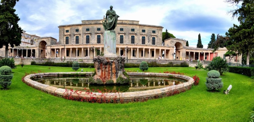 Vor dem von dem britischen Hochkommissar Sir Frederick Adam erbaute Palast von St. Michael und St. George. Mit ihm wurde die Folge von der französischen auf die britische Beherrschung der Insel dokumentiert. Nachdem Korfu 1864 an das Königreich Griechenland gefallen war, nutzte man das schnuckelige Häuschen bis zum zweiten Weltkrieg als Residenz des griechischen Königs. Nunmehr findet es als Museum für asiatische Kunst Verwendung; außerdem ist in ihm eine Kunstgalerie untergebracht. Sir Frederick Adam war auf Korfu aufgrund seiner Verdienste bez. der Erweiterung der Infrastruktur hoch angesehen; auch aus diesem Grunde schaut er vom Podest vor dem Palast auf die Besucher herab.