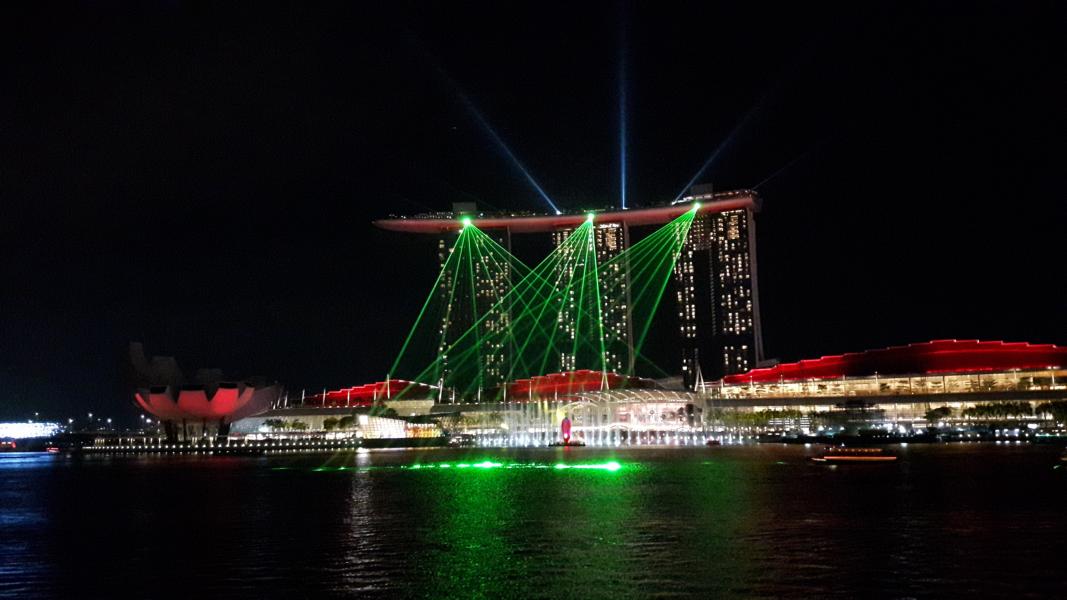 liegt das Marina Bay Sands-Hotel und mit uns warten viele Menschen auf die