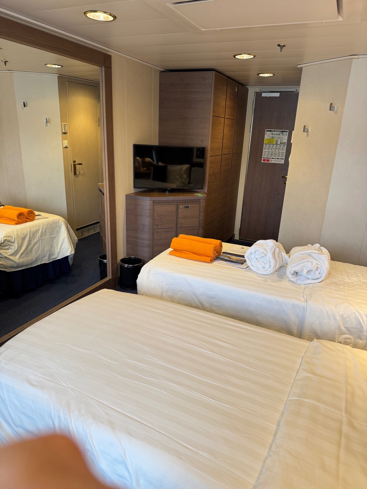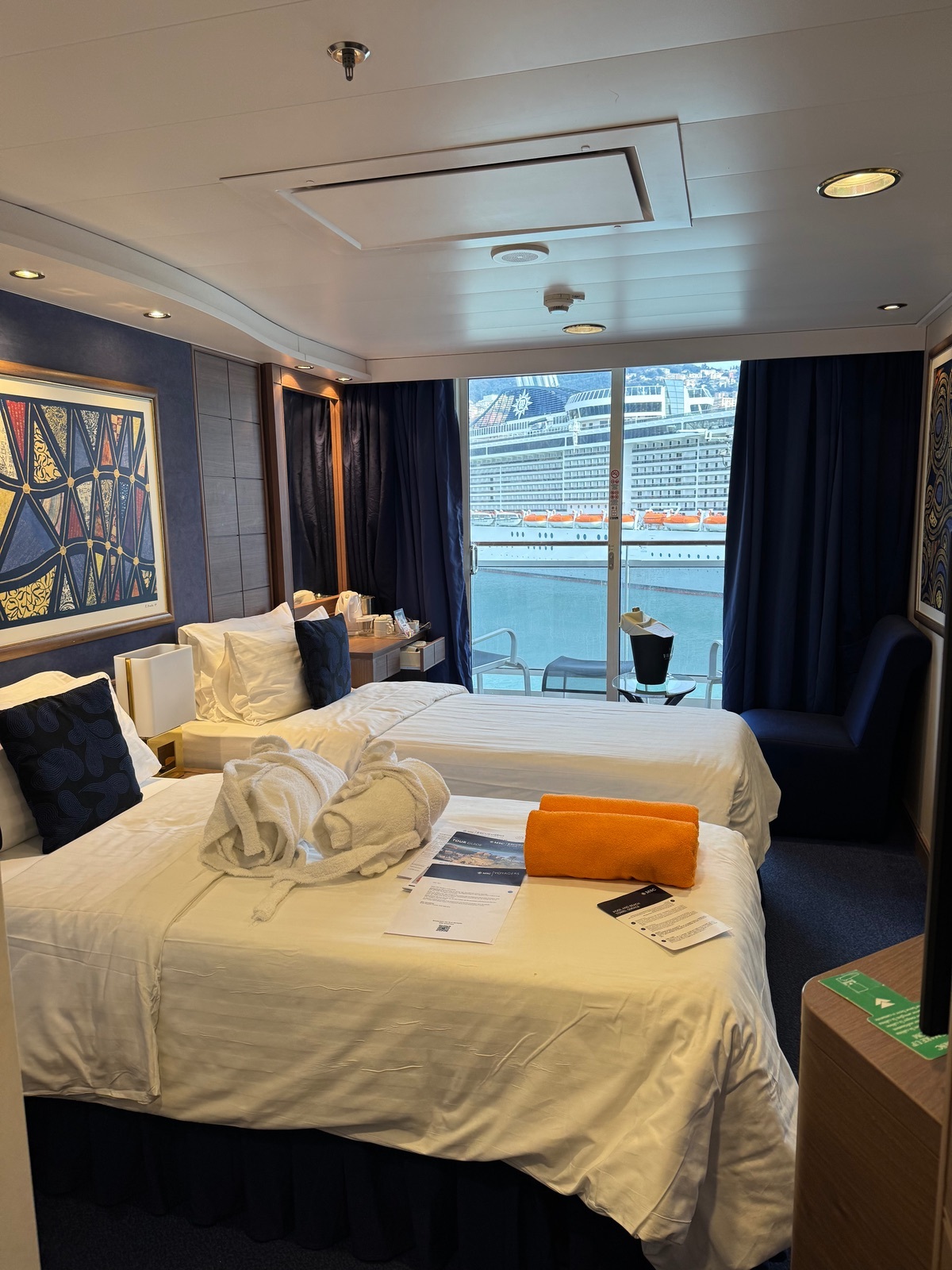 Unsere Koffer kamen auch recht zügig, sodass wir selber, kurz nachdem wir uns an der Musterstation gemeldet hatten, auch schon in der Kabine häuslich einrichten konnten.