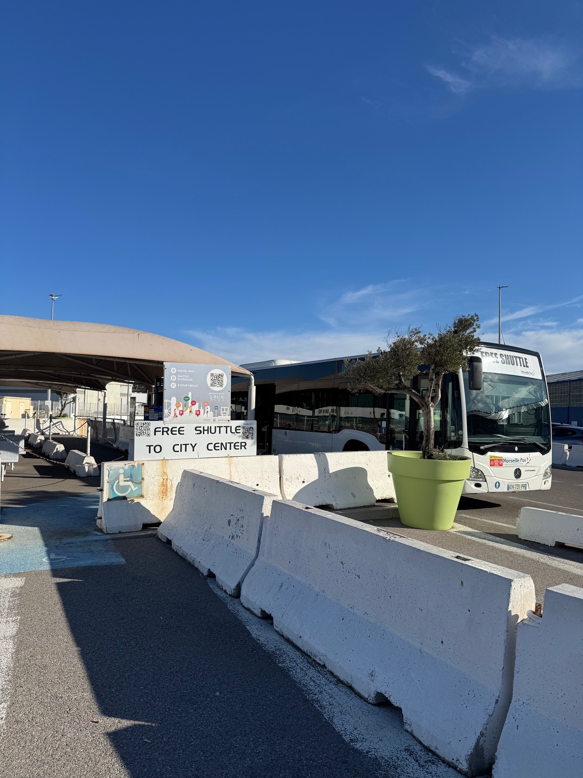 Wie bereits schon im Reisethread mitgeteilt, nahmen wir anstatt den kostenpflichtigen Shuttle (17 €/Pers) den „Free Shuttlebus“, um aus dem sehr weitläufigem Hafengelände Richtung Stadt und Alten Hafen herausgefahren zu werden.