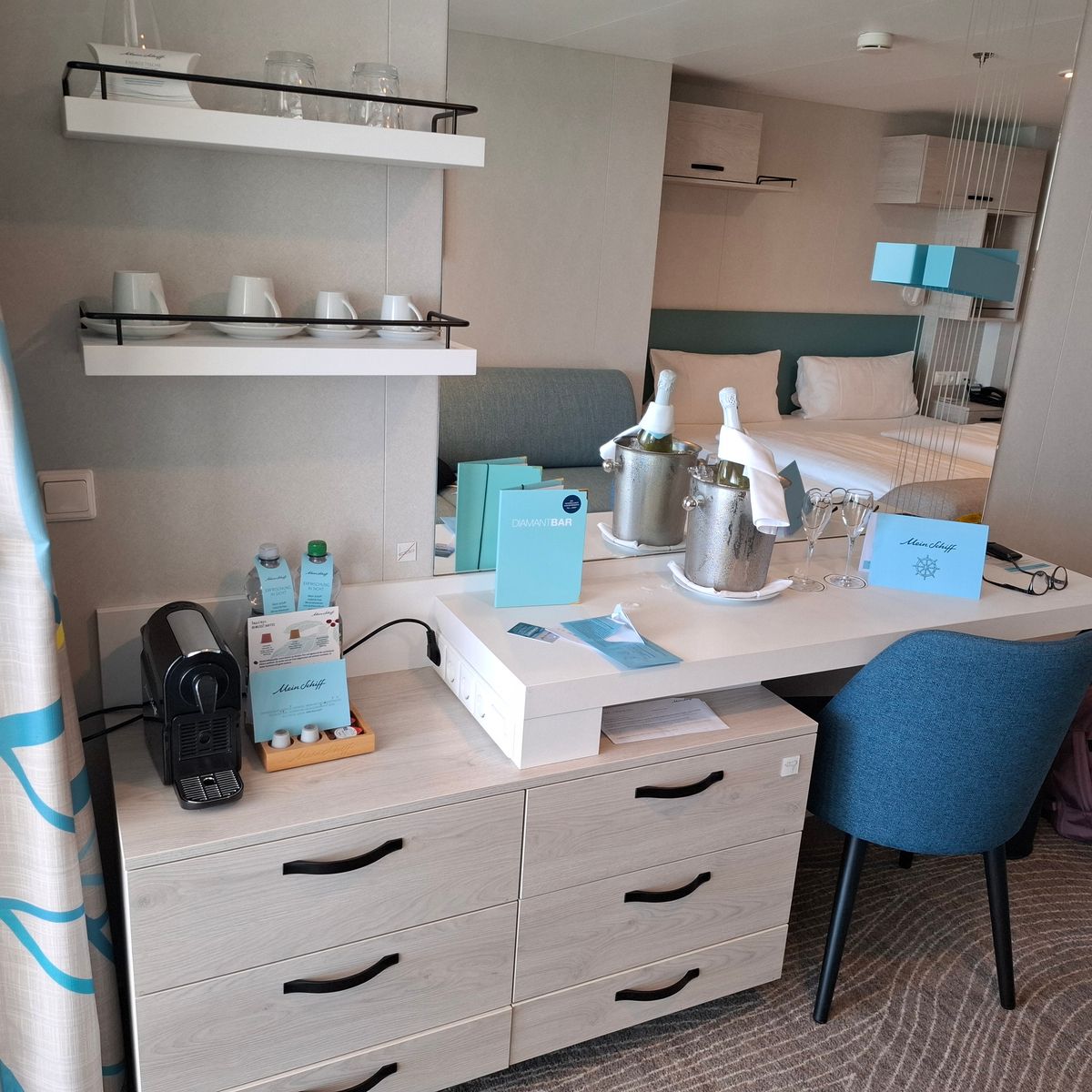 Nachdem Mittag war auch unsere Balkonkabine bezugsfertig und wir haben uns auf zur Kabine gemacht und waren sehr positiv überrascht wieviel Platz in der Kabine ist und wieviel Aufbewahrungsmöglichkeiten es gibt. Wir haben nicht mal alles an Fächer etc. benötigt. Wir haben zu zweit eine Balkonkabine gebucht auf Deck 11.