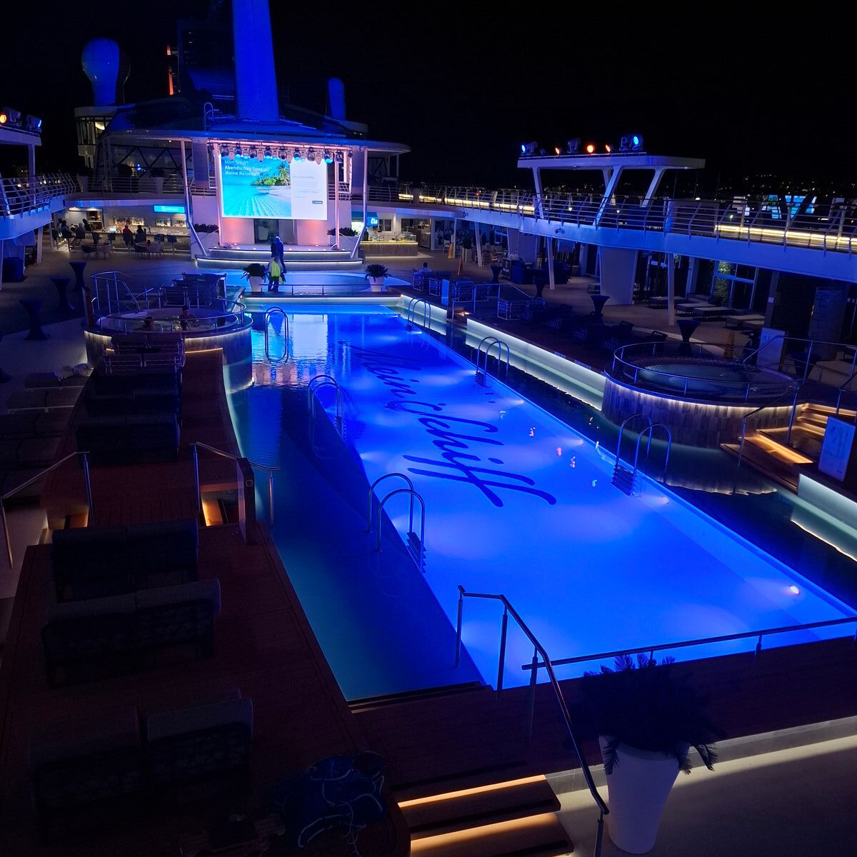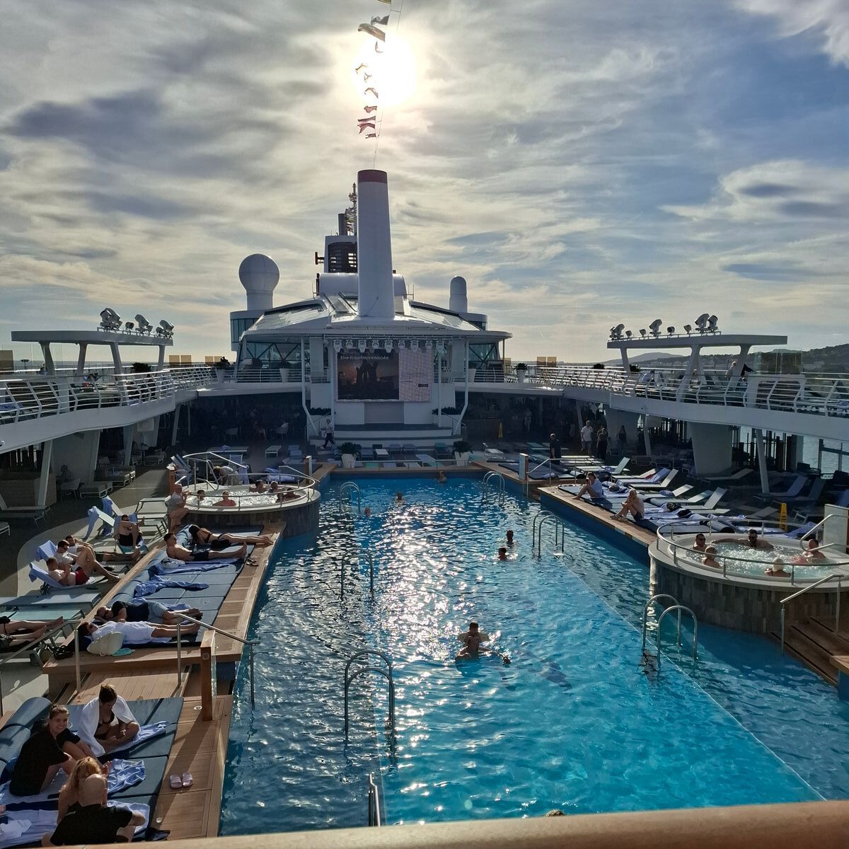 Später gab es noch die Wilkommensparty au dem Pooldeck. Danach sind wir müde ins Bett gefallen.