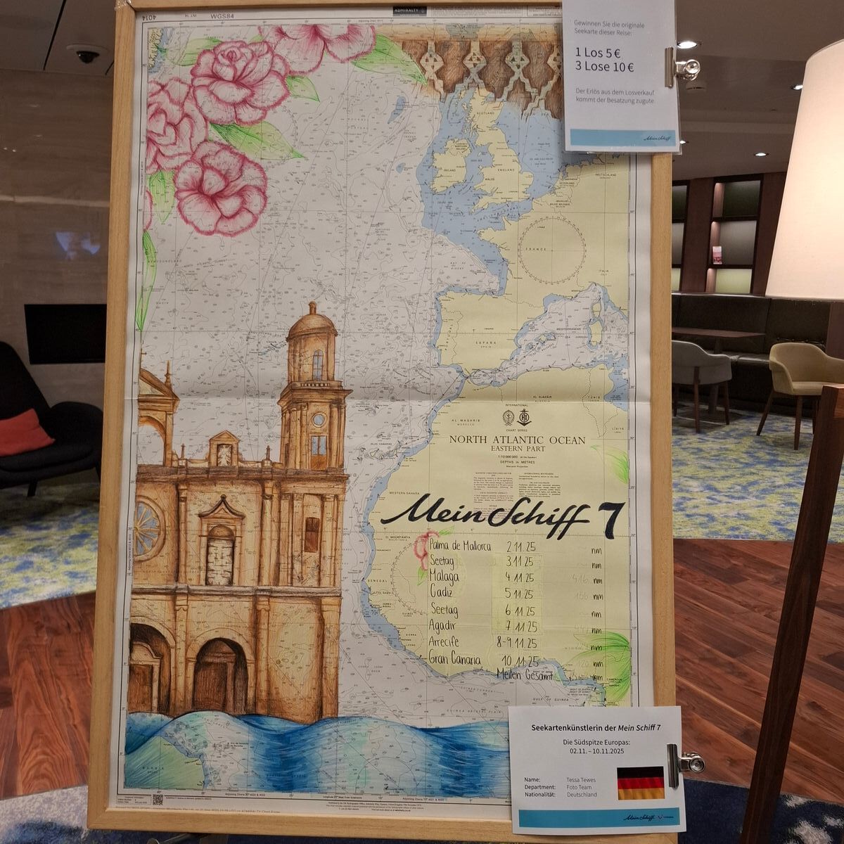 Im Laufe des Tages haben wir uns auf dem Schiff treiben lassen. Bei der Rezeption stand die tolle Seekarte der Reise, welche man auch am Ende gewinnen konnte, wenn man sich entsprechend Lose kauft. Ich finde die Karte ist wunderschön gestaltet worden.