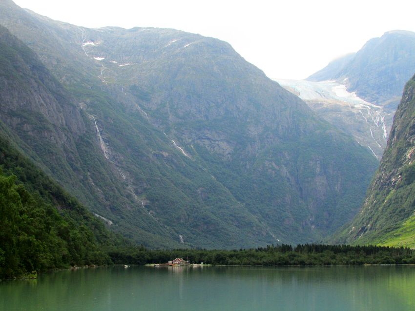 Ein "Zwerg" zwischen lauter Riesen: Die von den hohen Bergen eingerahmte "Kjenndalstova" - ein Restaurant, in dem uns Kaffee und frische Waffeln mit leckerer Erdbeermarmelade erwarten - verdeutlicht die gewaltige Natur Norwegens. Im Hintergrund ist bereits ein Teil des Kjenndal-Gletschers zu sehen. Angesichts dieser gewaltigen Dimensionen, welche dieses Foto gut verdeutlicht, verwundert es sicherlich nicht mehr, dass der Tsunami von 1936 eine unfassbare Höhe von bis zu 72 Metern erreichte.