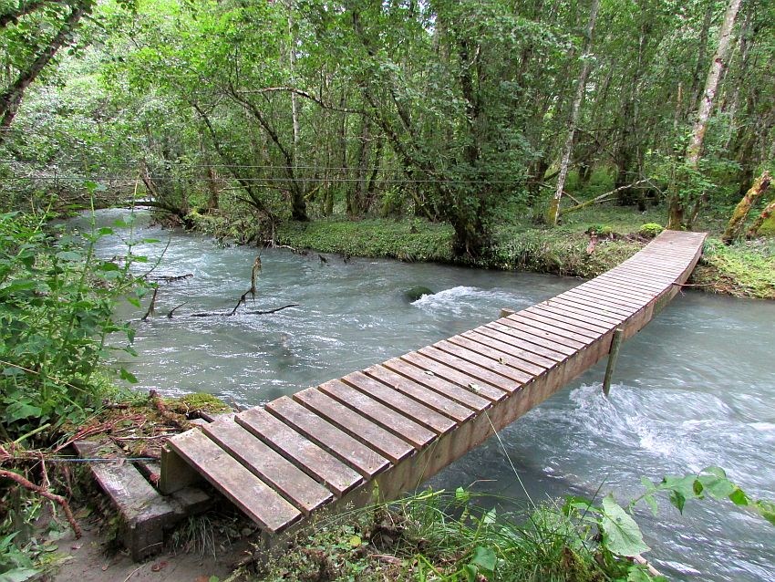 Was für eine tolle Gegend! Irgendein Gletscherfluss in nachbarschaftlicher Nähe zum Restaurant rauscht durch ein grünes, naturbelassenes Wäldchen. Kleine Brücken sollen eigentlich hier und da hinüberführen, doch je nach Wasserhöhe und Fließgeschwindigkeit können die auch schon mal verschoben werden. Dann machen sie das Überqueren zu einem kleinen Abenteuer. Wir haben keine Lust auf ein unfreiwilliges Bad im kalten Gletscherwasser und schauen uns das Ganze daher vom - wenn auch teils etwas schlammigem - Ufer aus an.