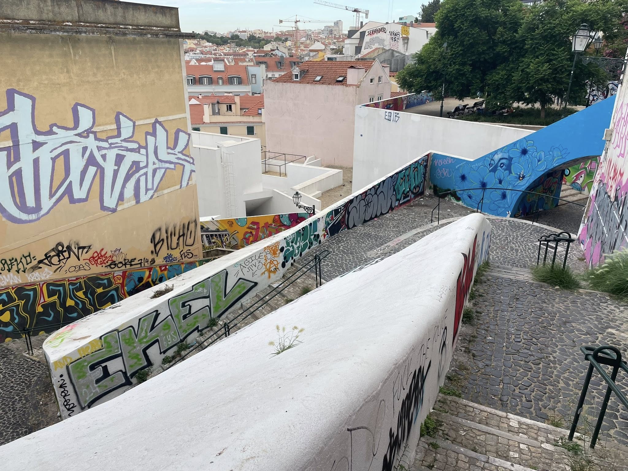 Doch nicht nur die Aussicht lohnte sich. Gleich nebenan entdeckten wir die Caracol da Graça, eine lange Treppe, die hinunter ins Viertel führt. Ihre Mauern waren über und über mit bunten Graffitis bedeckt – eine lebendige Freiluftgalerie.