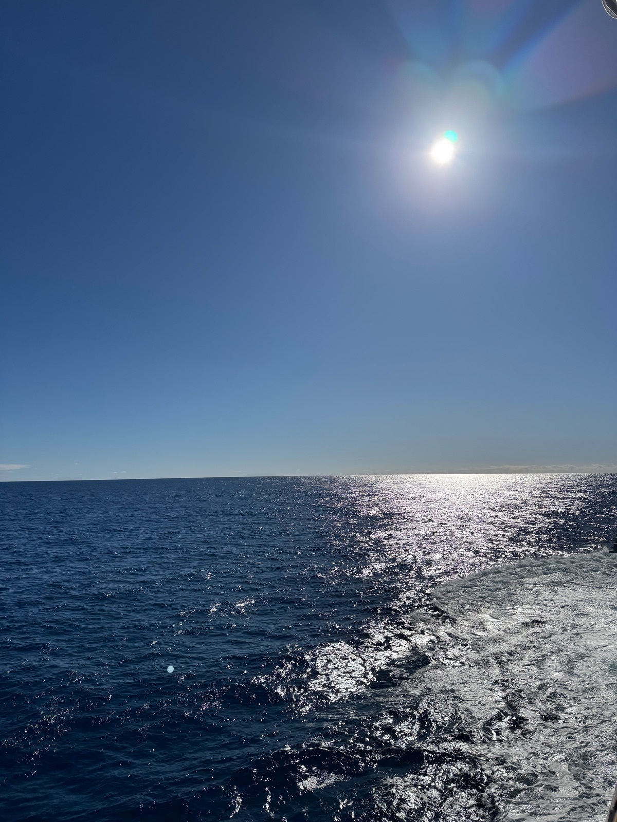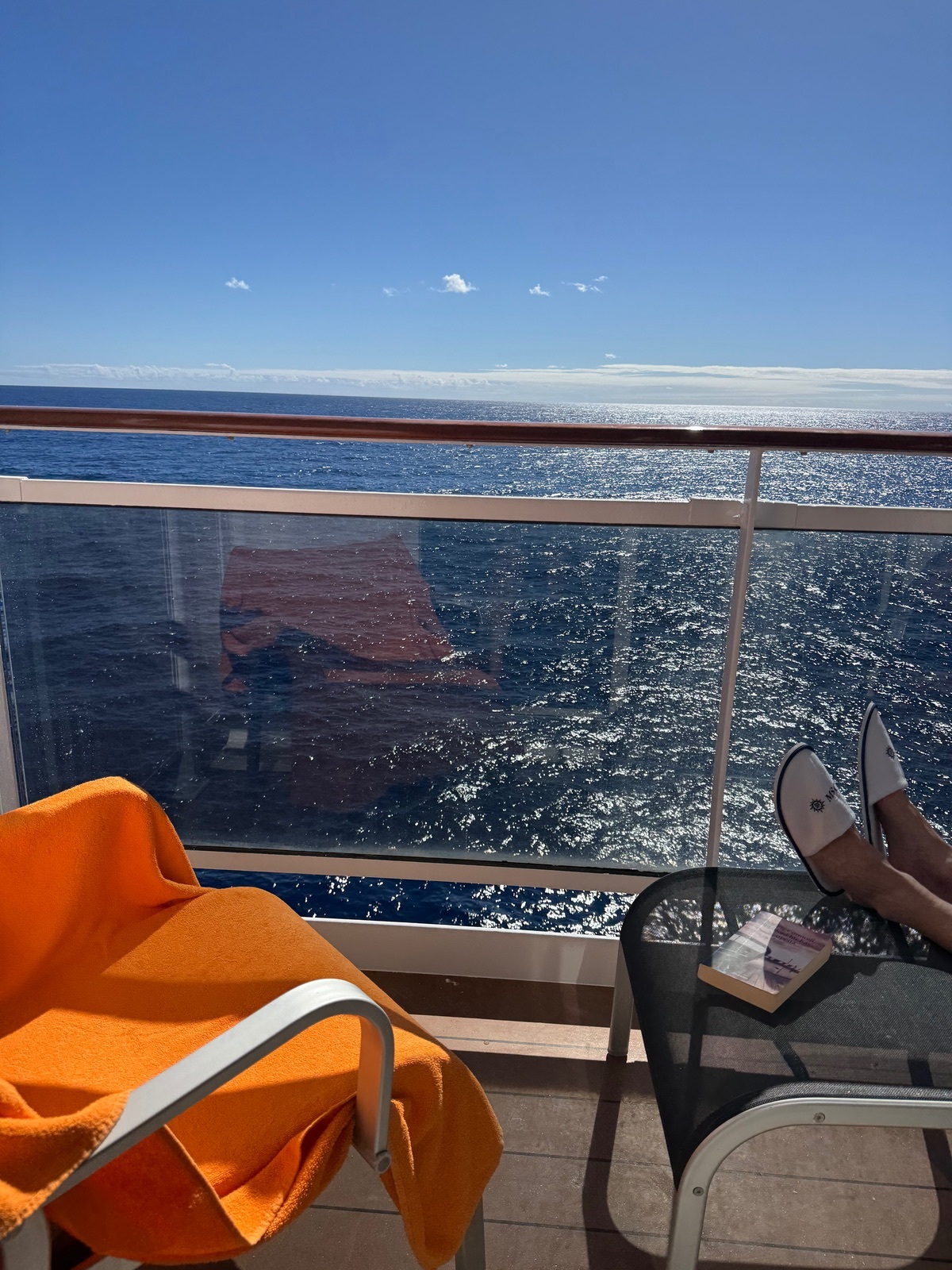 Wir sitzen jetzt, nachdem wir das Abendessen genossen haben, noch etwas auf dem Kabinenbalkon und schauen hinaus auf den weiten Atlantik, hören dabei dem herrlichen Rauschen der Wellen zu.