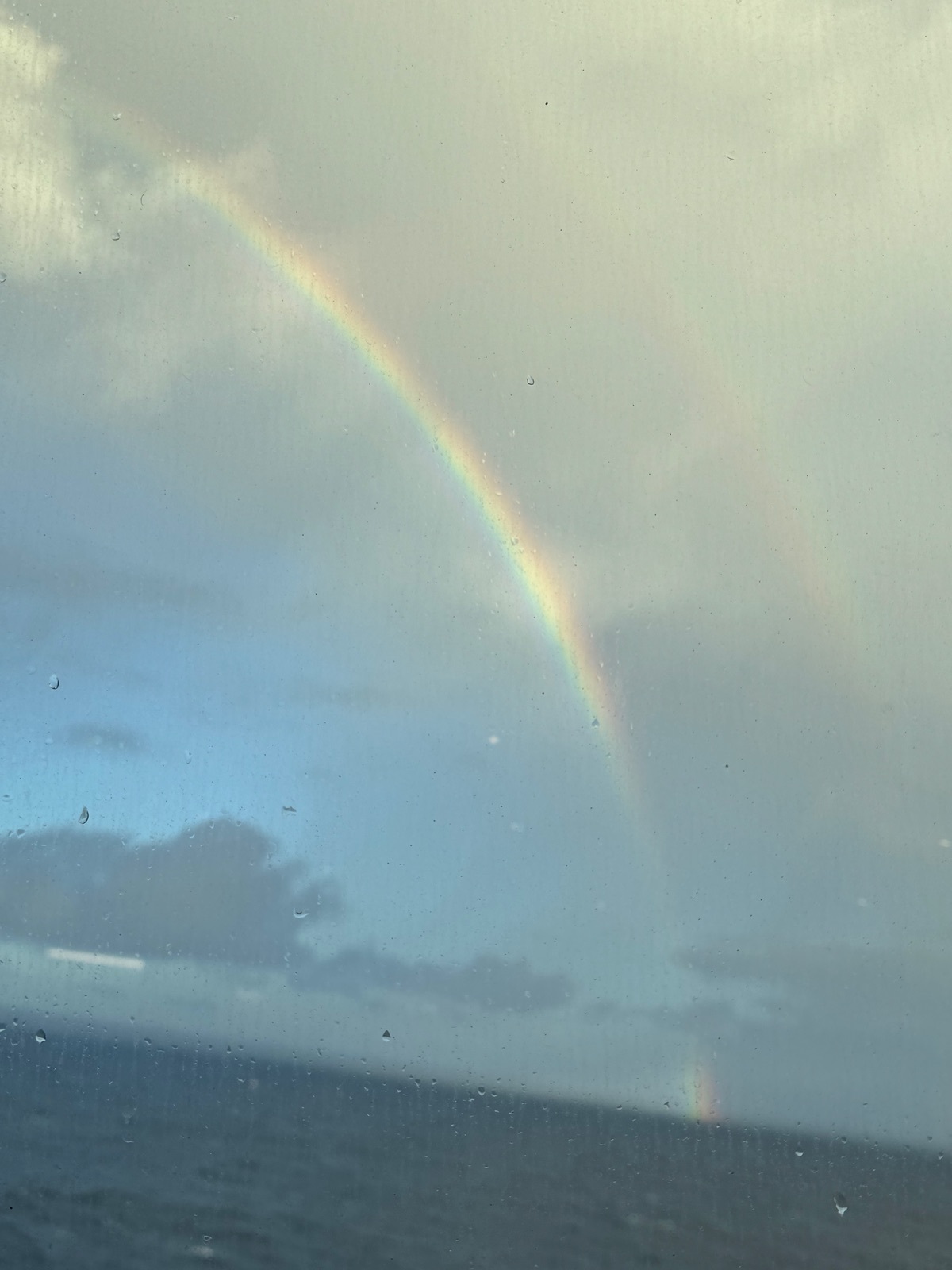 Beim Frühstück begleitete uns ein Stück dieser Regenbogen, schemenhaft, durch die etwas angeschmuddelte Scheibe erkennbar, waren es sogar zwei Bögen.