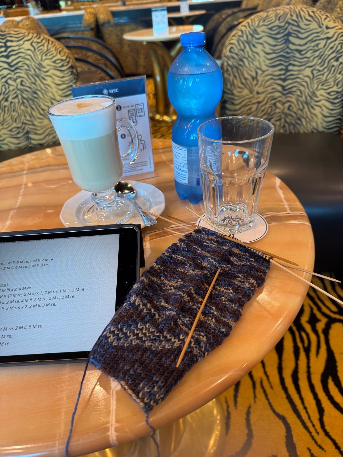 Unsere Balkonmöbel waren am Vormittag noch feucht vom frühmorgendlichem Regen, sodass ich mich mit meinem Strickzeug zunächst in die Tigerbar auf einen Latte-Macchiato verzog, derweil mein Mann sich dem morgendlich angebotenem Frühsportangebot hingab.