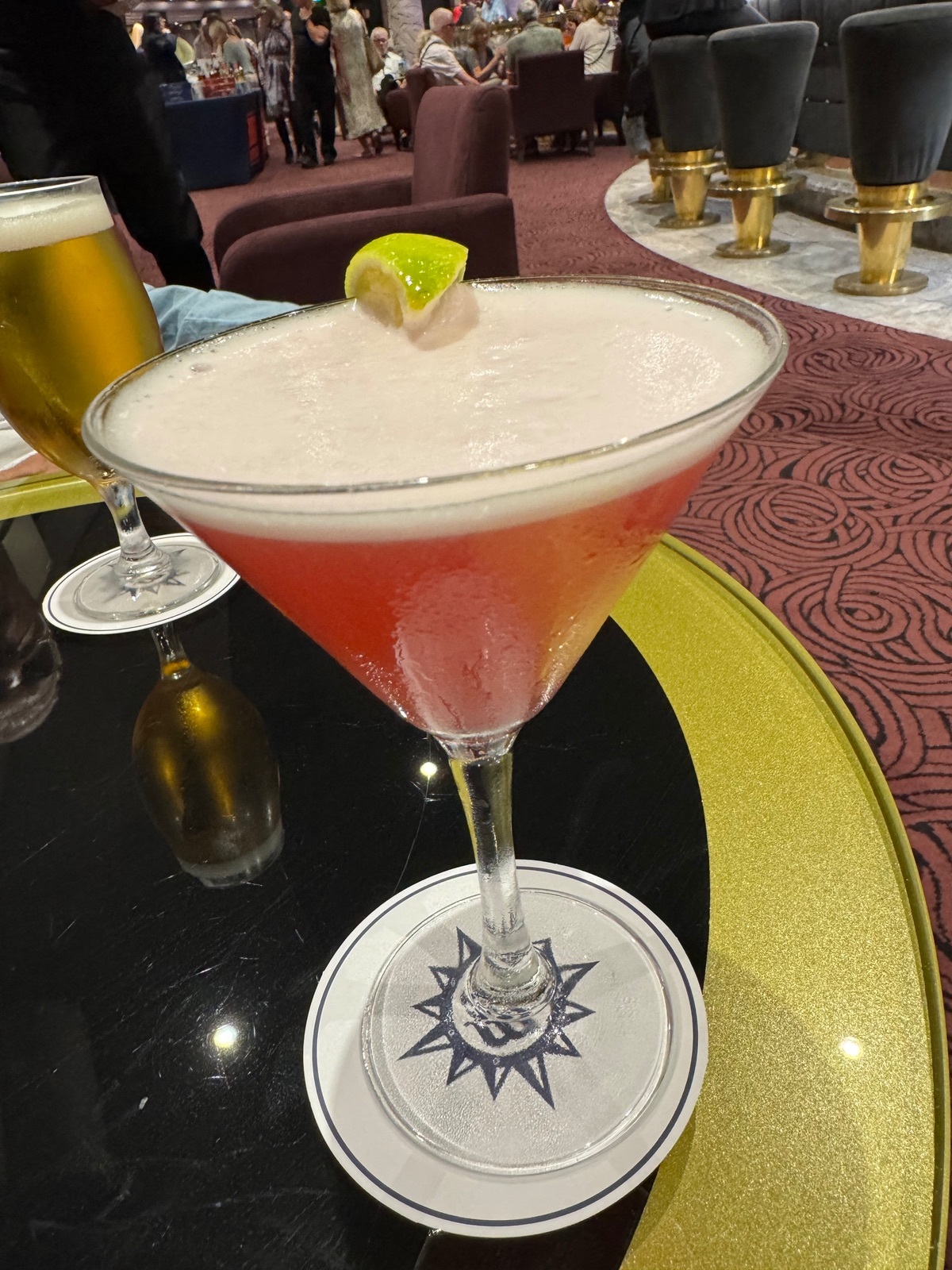 Wir haben uns, nach dem wieder einmal sehr leckerem Abendessen, für die Purple Bar auf Deck 6 entschieden und lauschten hier Louis musikalischen Klängen mit seinem „Sting-Tribut“ Repertoire zu, welche aus dem Atrium von Deck 5 zu uns hinaufklangen.