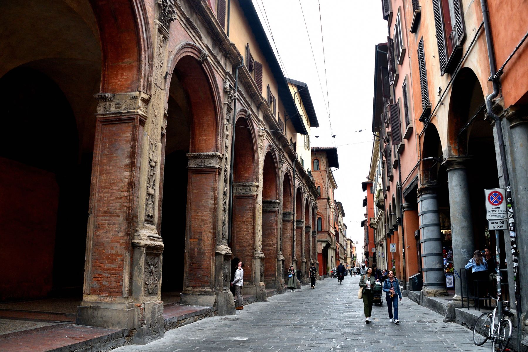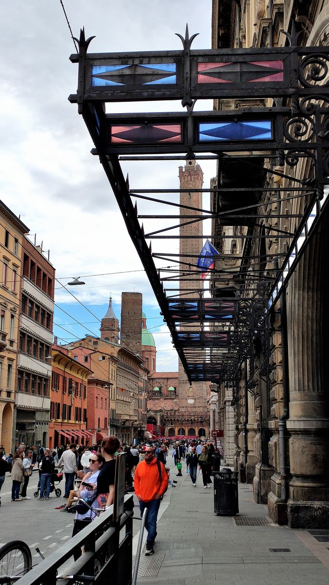 Weiter auf dieser lebhaften Straße. Vorbei an monumentalen Geschäfts- und Wohnhäusern sahen wir unser nächstes Ziel – die schiefen Türme Garisenda und Asinelli.