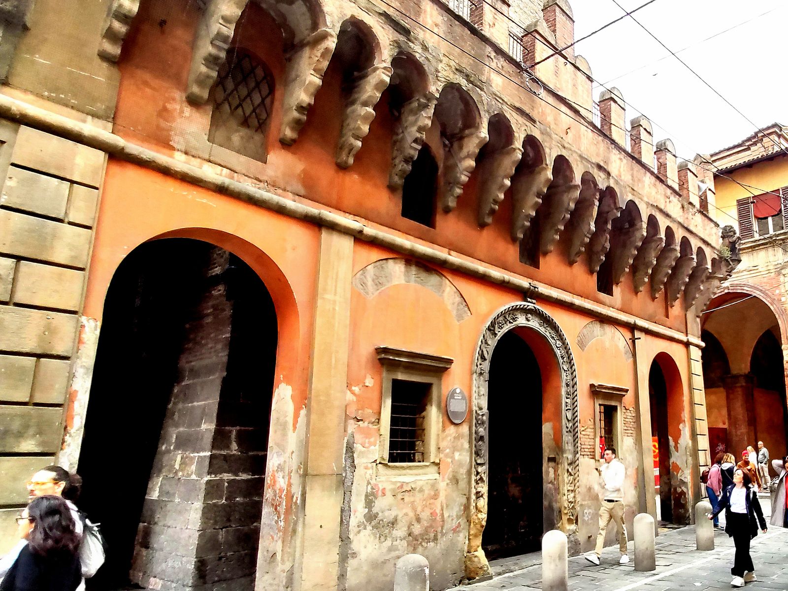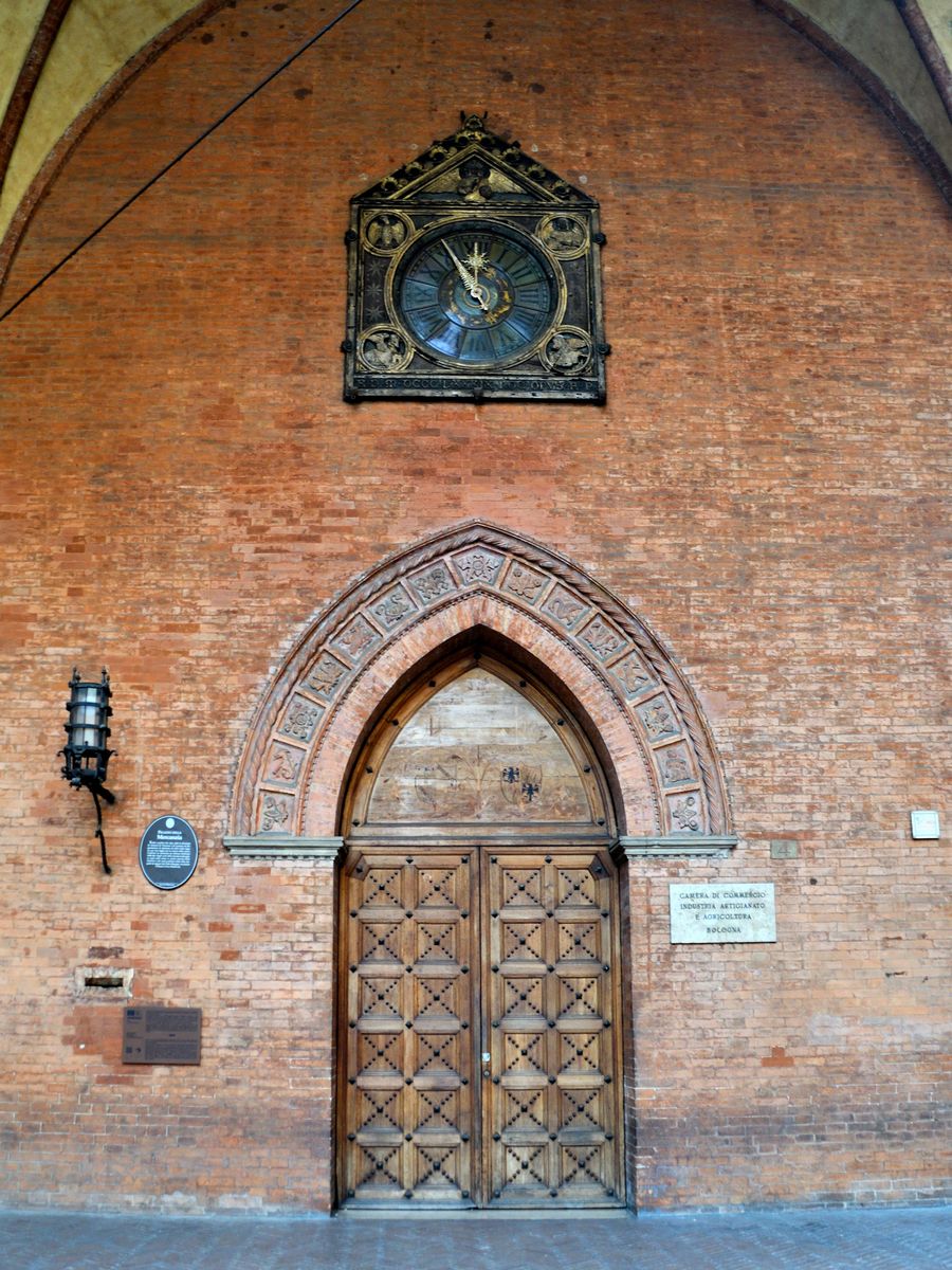 Im Hintergrund der Torre degli Asinelli, am Platz direkt eine Arkaden umsäumte Ladenzeile, die auch schon bessere Zeiten gesehen hatte. Aber passend zu Bologna. Und passend zur Piazza della Mercanzia gab es den Palazzo della Mercanzia mit einer beeindruckenden Eingangsfront.