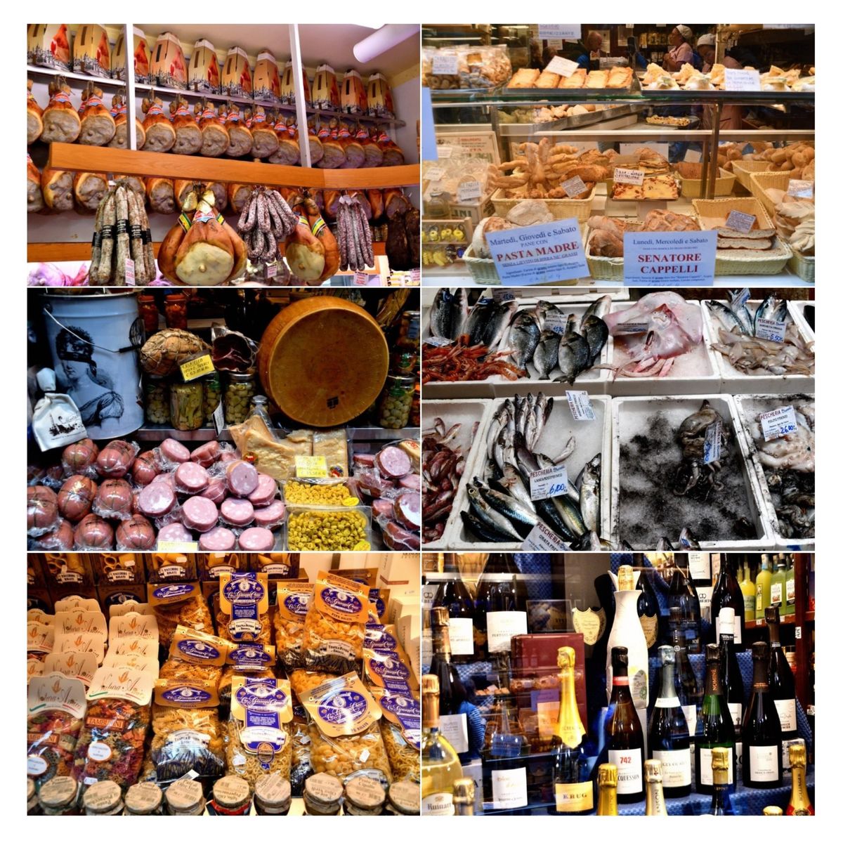 Frischer Fisch, Parmigiano Reggiano, frische Pasta, Mortadella, Prosciutto und Salami und viele andere Köstlichkeiten wie auch Weine und Sekt warteten auf die Käufer. Gut (oder auch nicht), dass es für den Rückflug die Gepäcksbegrenzung gab …